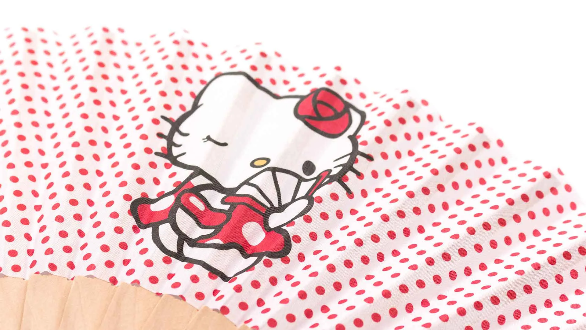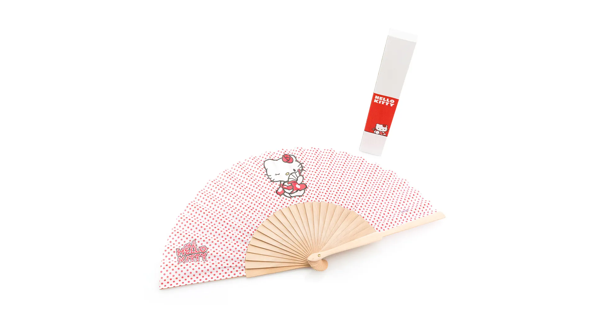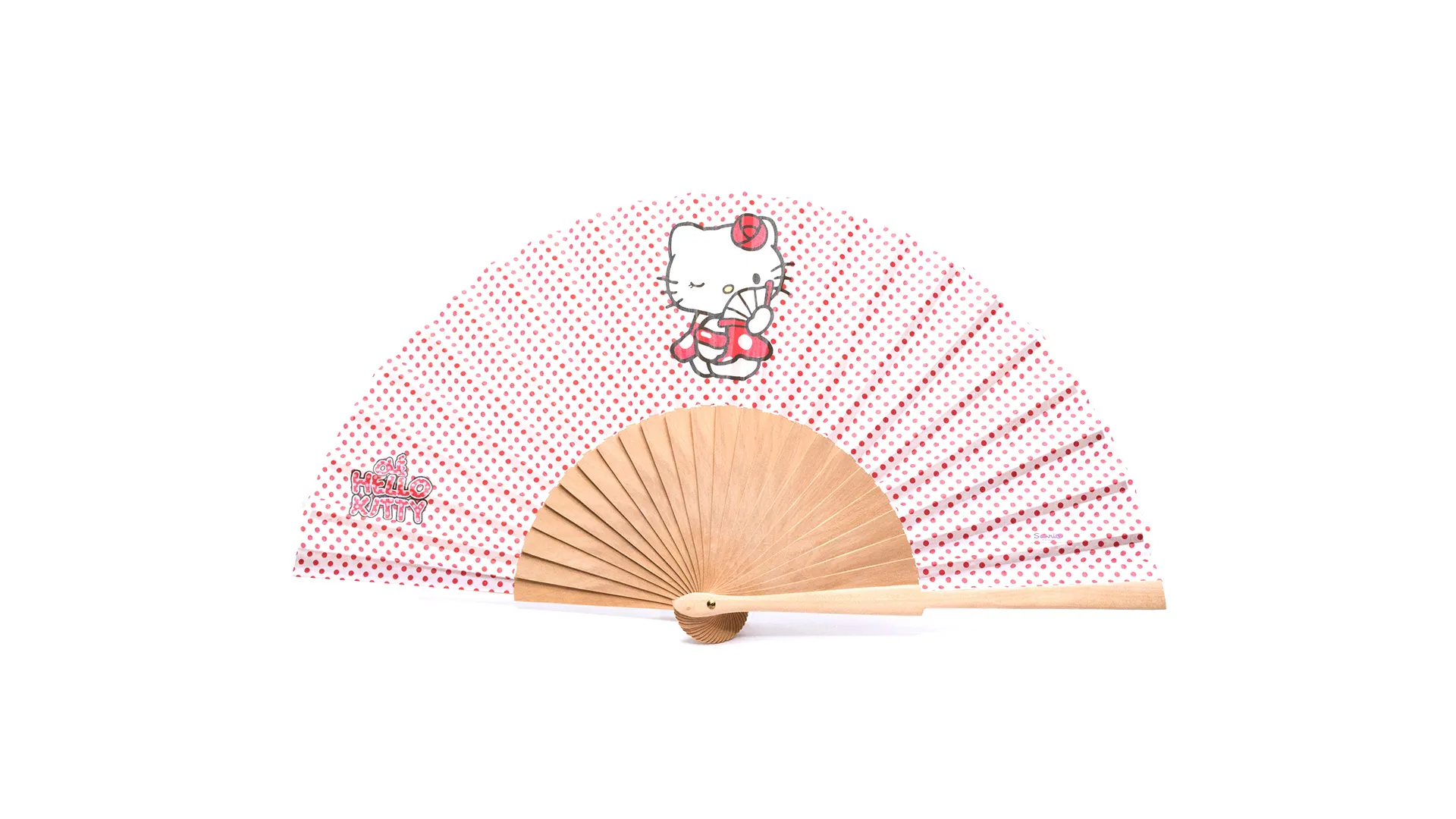 Abanico de Hello Kitty con varillas en madera natural y original diseño en tela con gatito de la marca. Presentado en caja individual.
