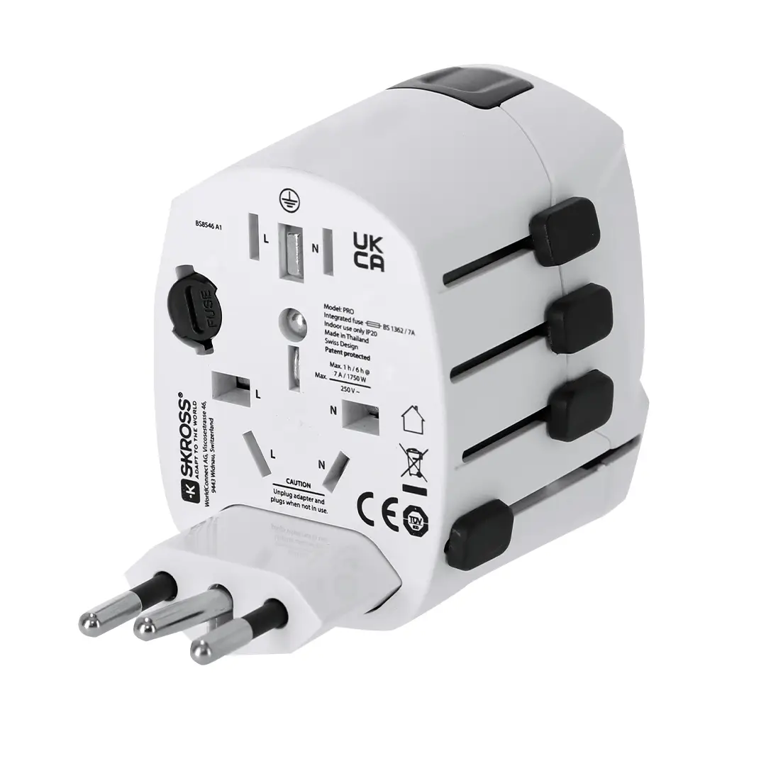 Completo adaptador de viaje universal marca SKROSS de diseño compacto y portable. Especialmente indicado para viajes y con adaptadores multi región. Apto para conectar dispositivos de alta potencia en cualquier lugar