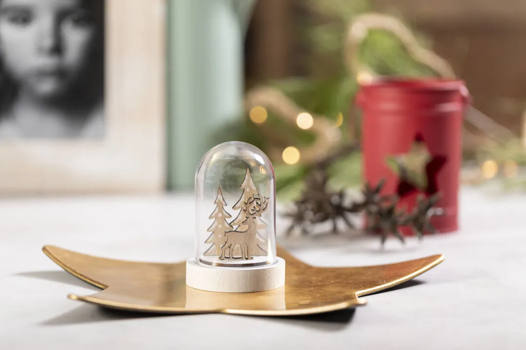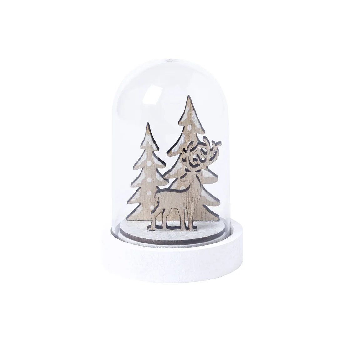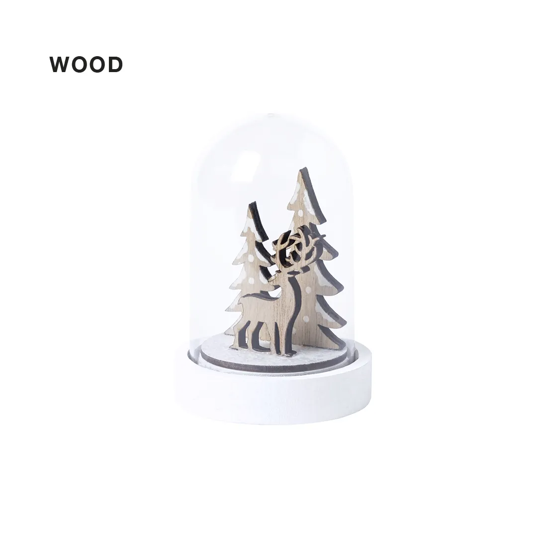 Adorno de navidad de original diseño con reno y árbol de navidad en su interior. Fabricada en resistente material acrílico, con base de madera lisa para impresión. Presentada en caja individual en color natural.