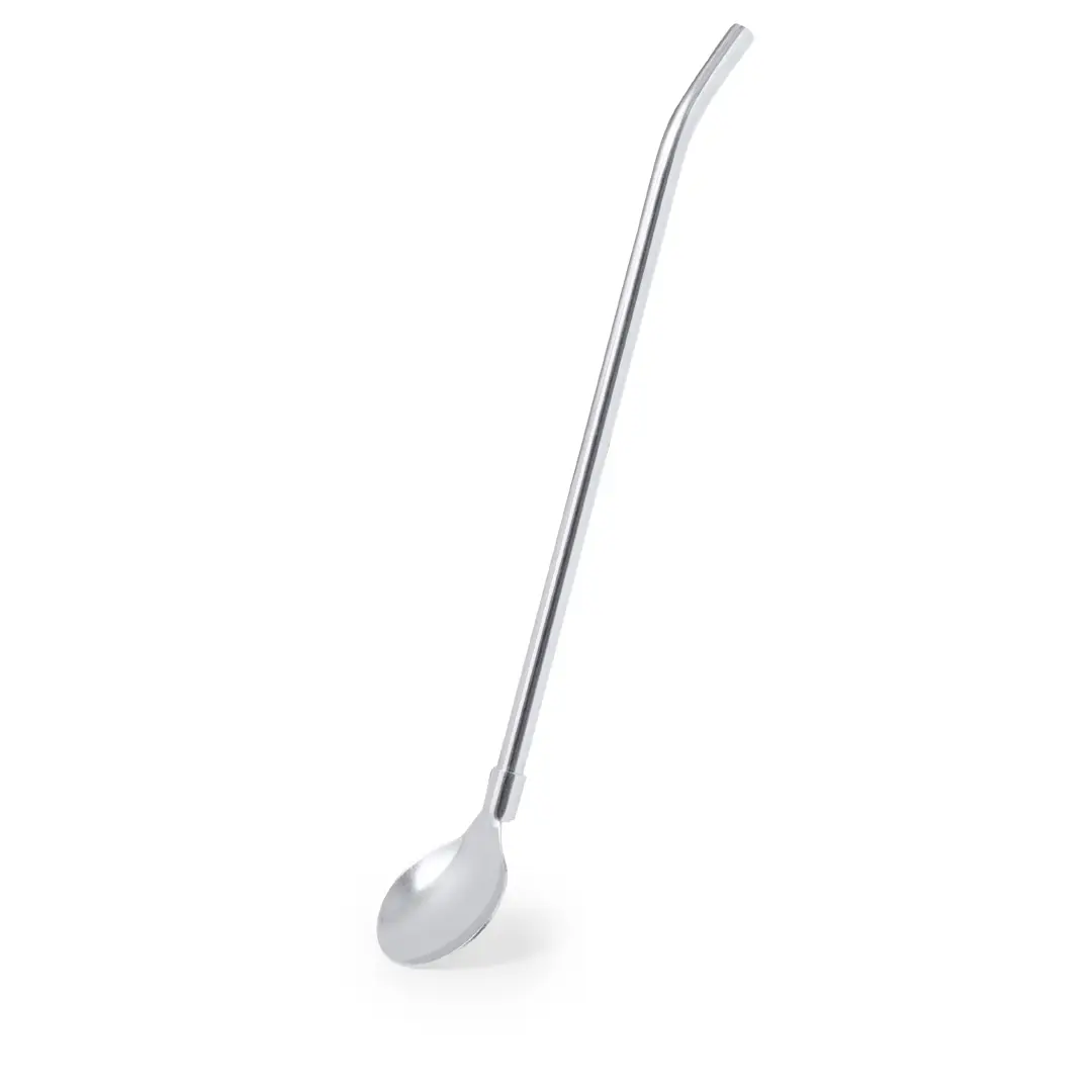 Práctico agitador con pajita en acero inox. Con diseño elegante y funcional, este accesorio es esencial para bebidas frías o calientes. Pajita integrada que permite absorber con facilidad y en el extremo inferior una práctica cucharilla. Presentado en una bolsa individual.