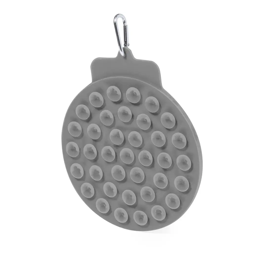 Almohadilla de mascotas para lamer fabricada en suave silicona. Con potentes ventosas para fijarla en superficies planas y que las mascotas puedan lamer su rugosa superficie. Mosquetón de transporte incorporado de fácil enganche. Presentado en una bolsa individual reciclada.
