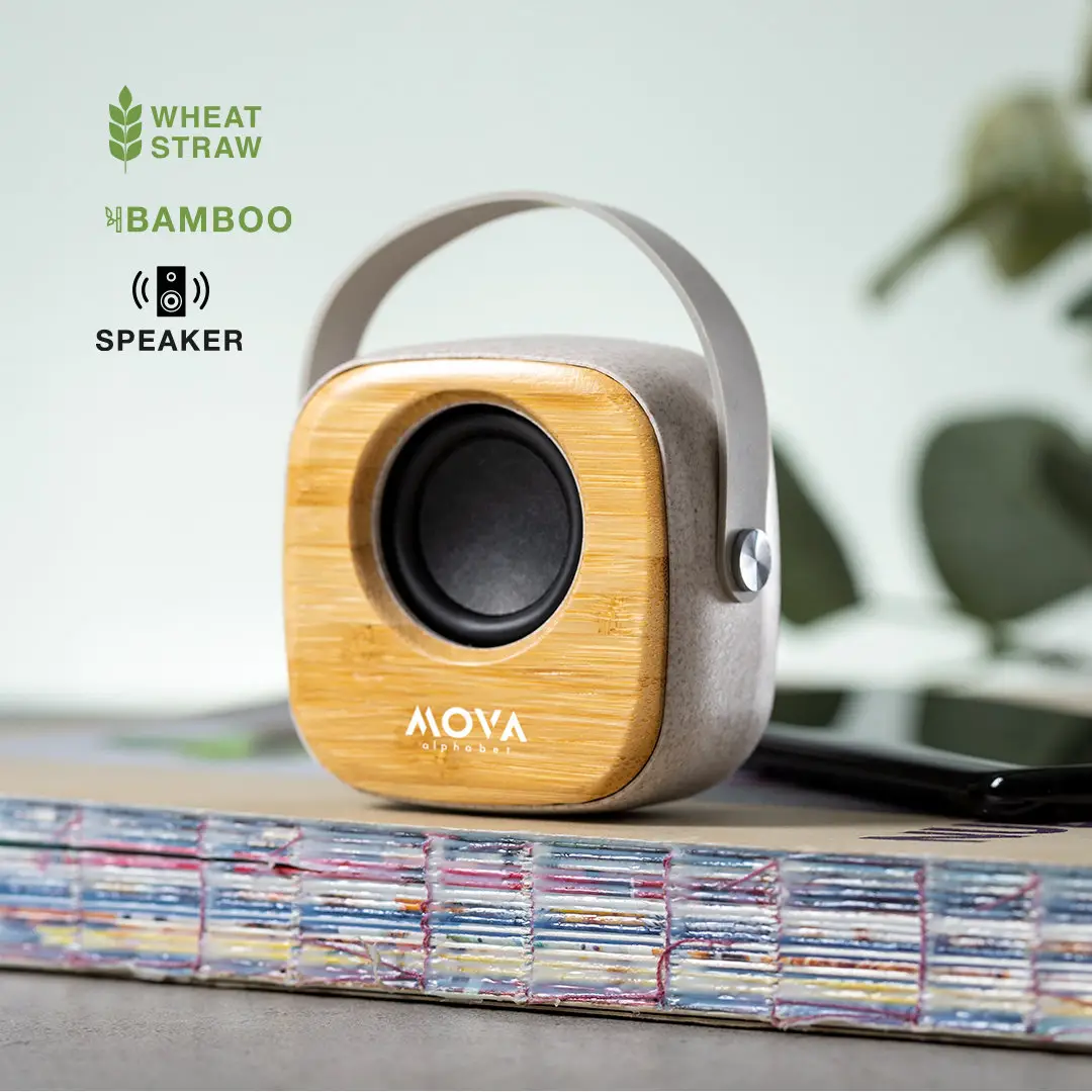 Altavoz Bluetooth en combinación de piezas de bambú de corte nature y carcasa en caña de trigo, para así fomentar la utilización de materias primas naturales y reducir las emisiones contaminantes. De tamaño compacto y con práctica asa de transporte en suave silicona, se convierte en un complemento perfecto para el smartphone. Conexión Bluetooth 5.0 y 3W de potencia, con entrada de línea jack 3,5mm (cable incluido). Compatible con iOS y Android, incluye cable de carga micro USB y viene presentado en atractiva caja de diseño. Disponible manual de instrucciones español e inglés.