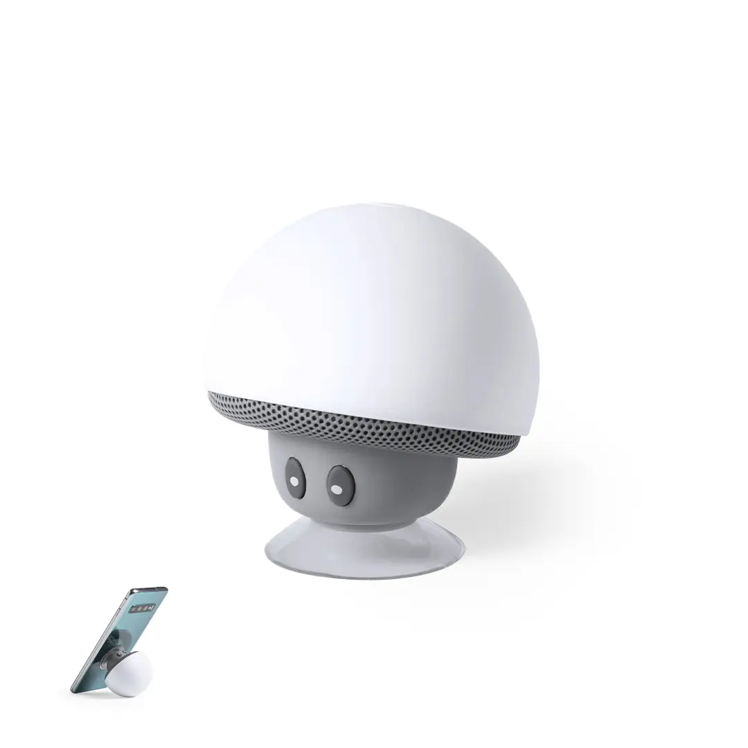 Altavoz de original diseño seta con función soporte para móvil. Conectividad Bluetooth 5.0, con 3W de potencia y función manos libres. Cuerpo con suave acabado de tacto goma y ventosa de fijación para función soporte. Cable micro USB incluido y presentado en atractiva caja de diseño.