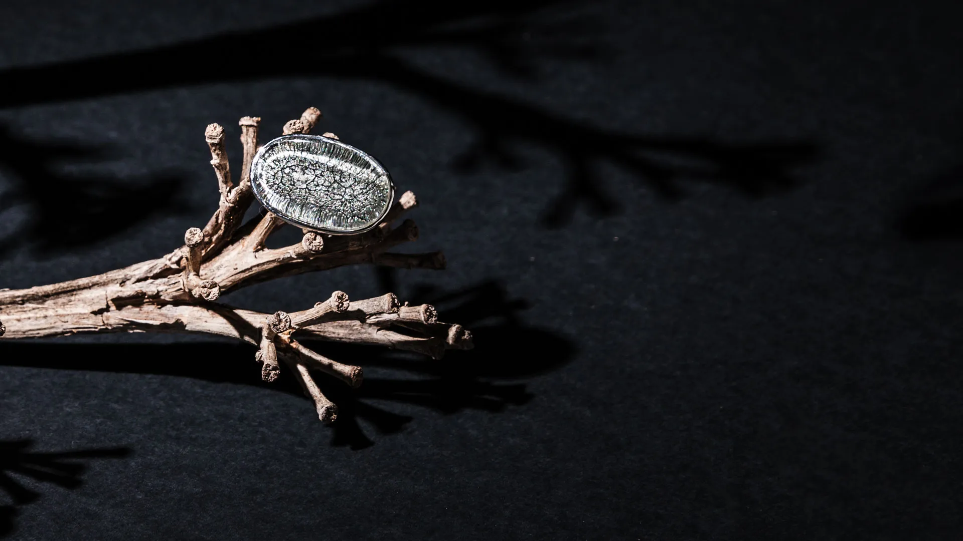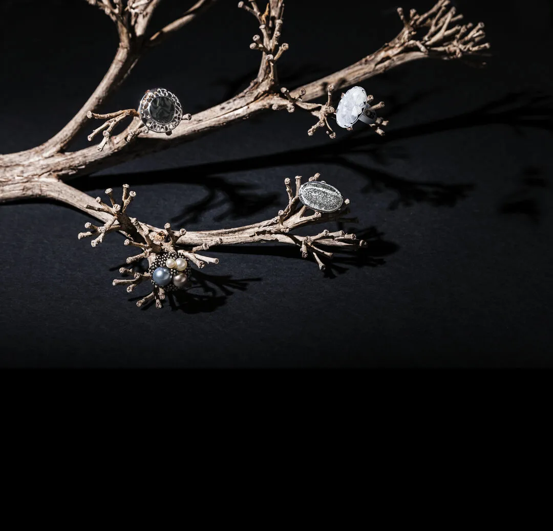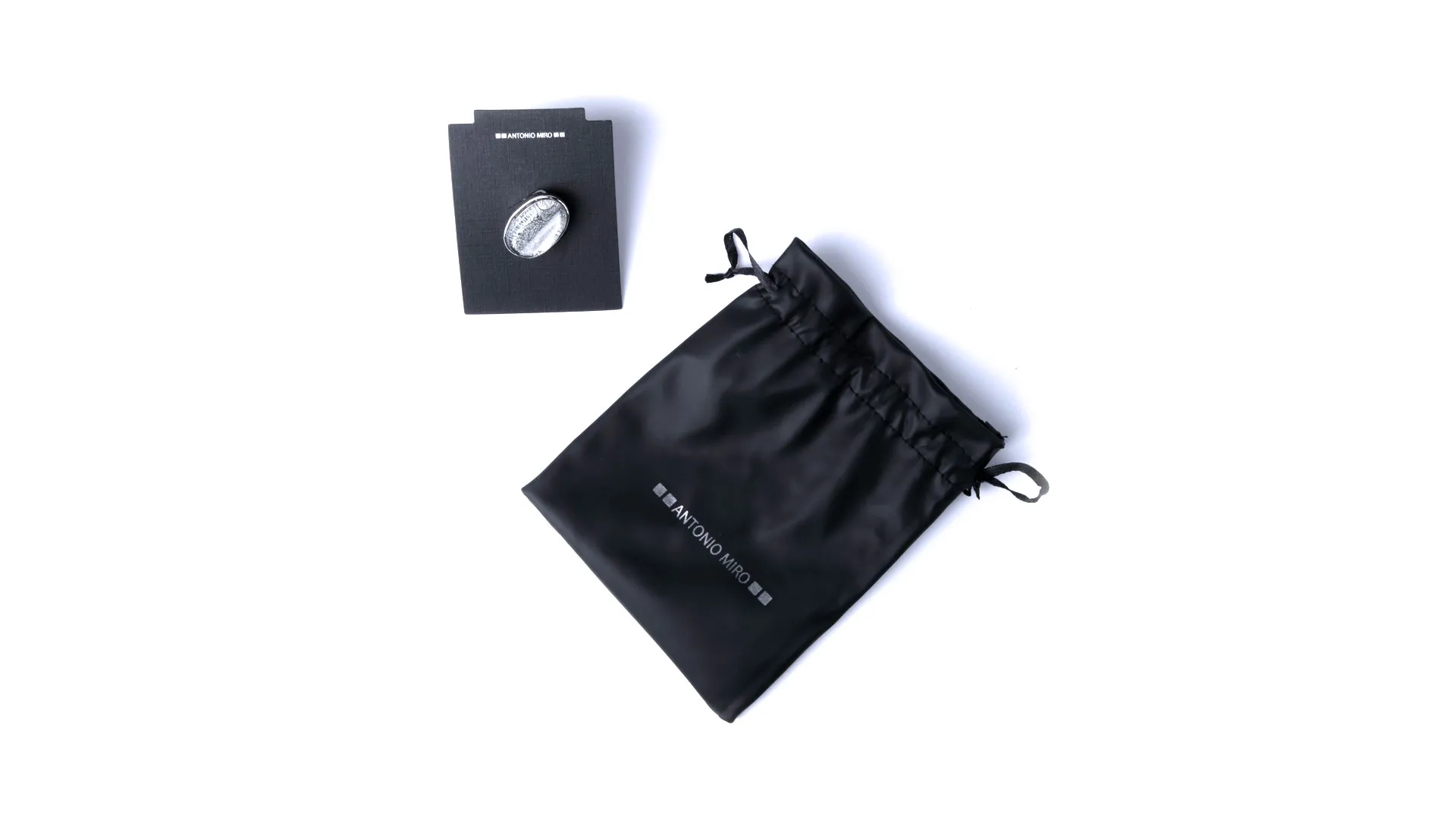 Anillo ajustable de Antonio Miró en metal con incrustación de resina. Presentado en funda de polipiel con logotipo de la marca.