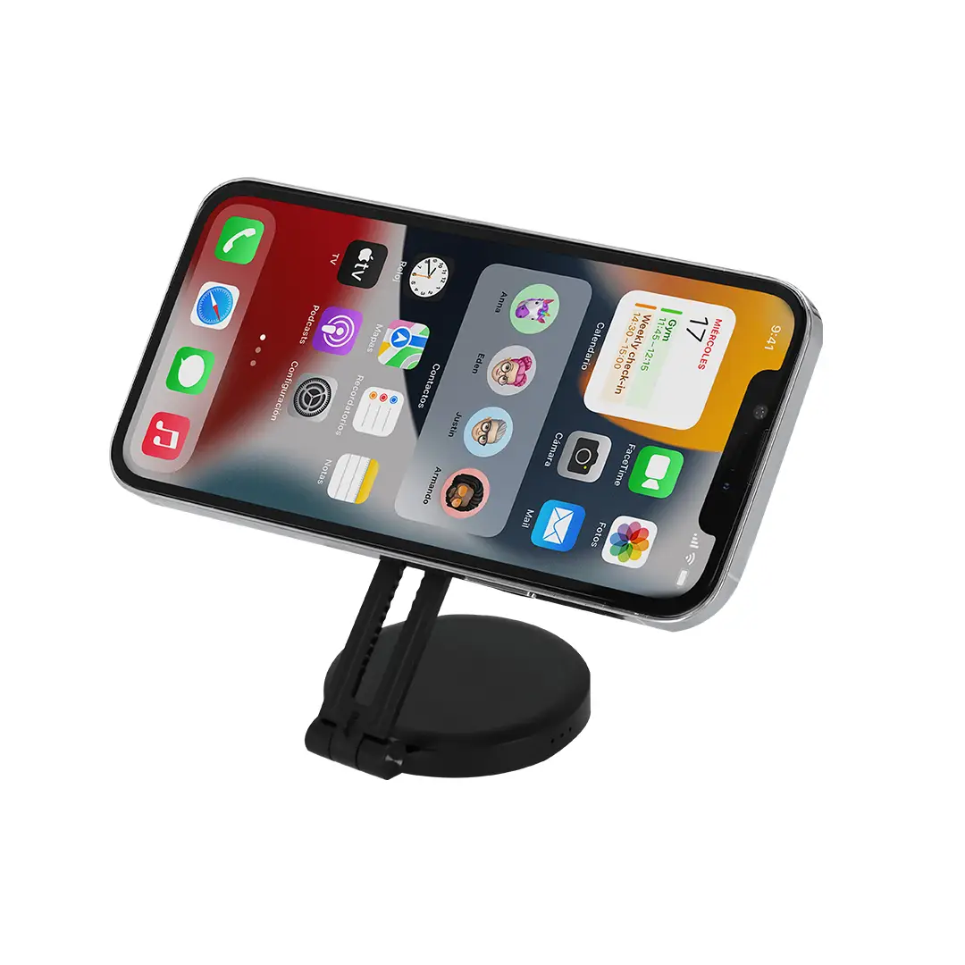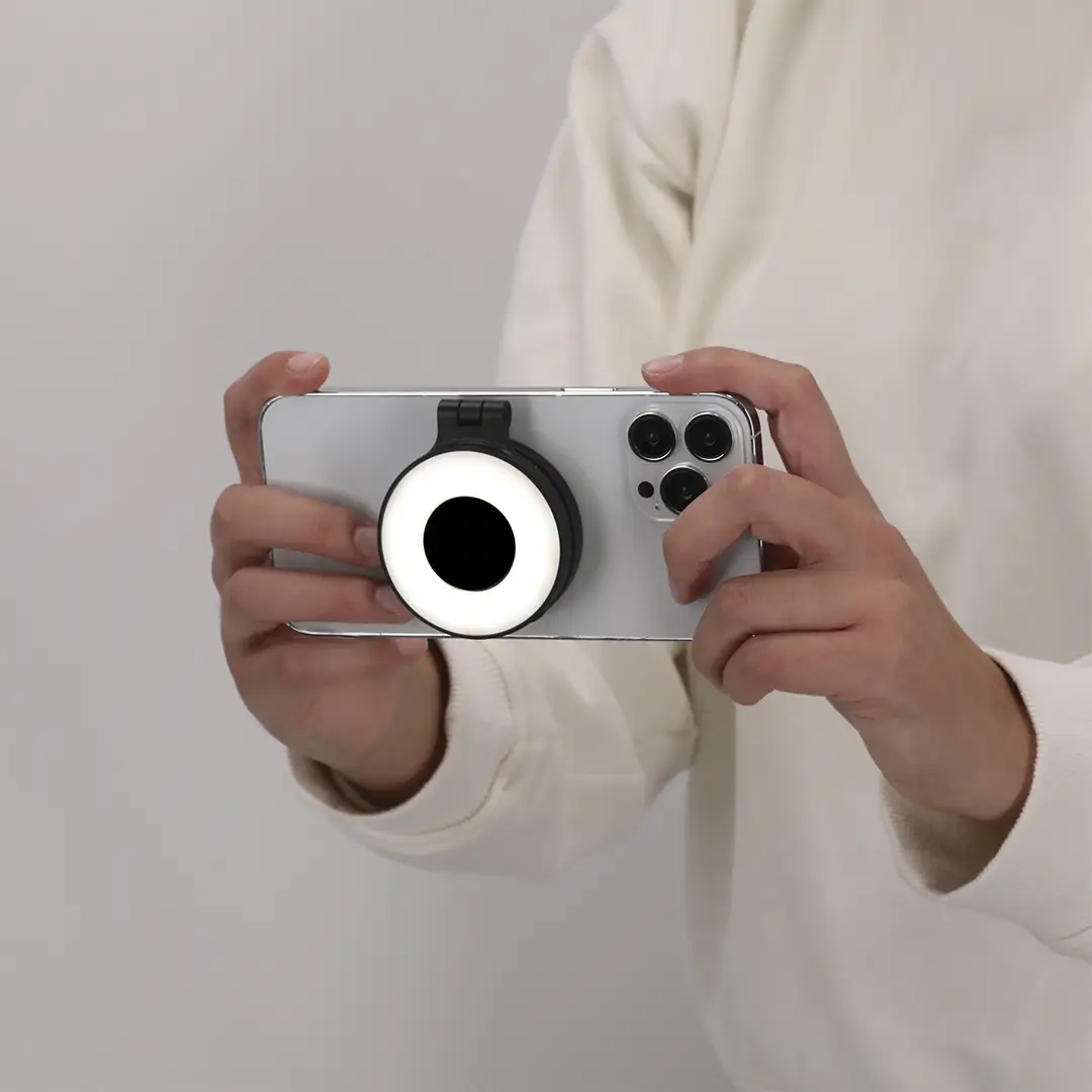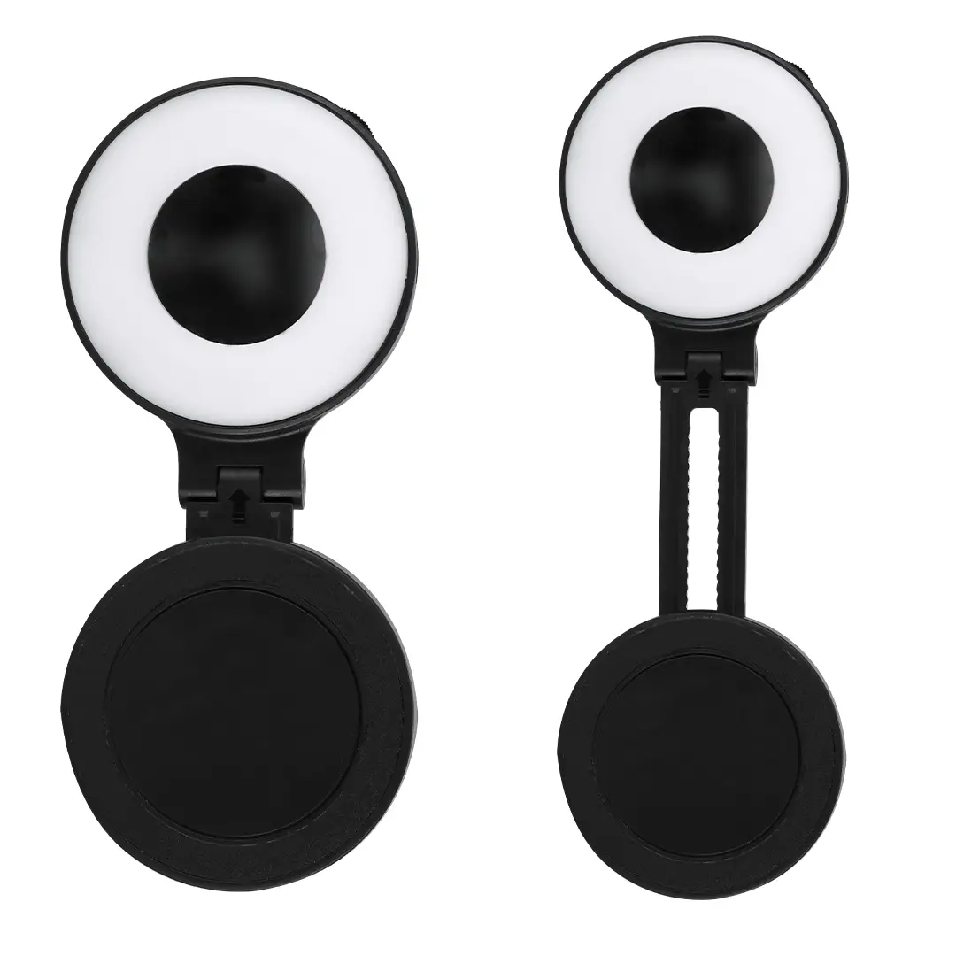 Anillo de luz led con acople para smartphone magnético, fabricado en resistente ABS. 24 ledes, con 3 modos de luz e intensidad regulable y recargable por USB (cable Tipo C) de batería 450 mAh. Con soporte extensible, ideal para ponerlo en diferentes posiciones en tu smartphone u ordenador