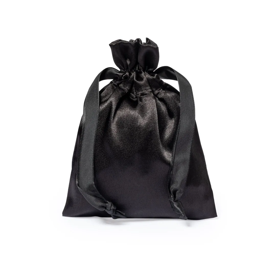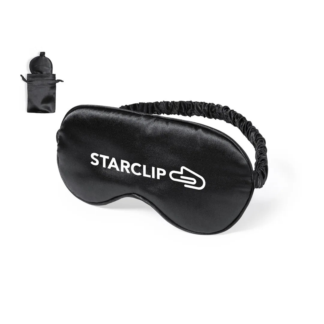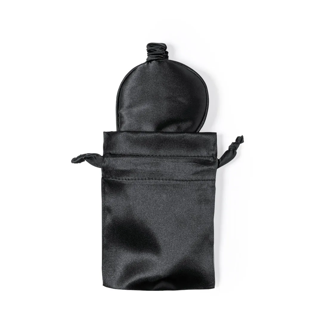 Antifaz de descanso en suave satén, con cinta elástica a juego. Presentado en bolsita individual de satén con cierre de cordón a juego.