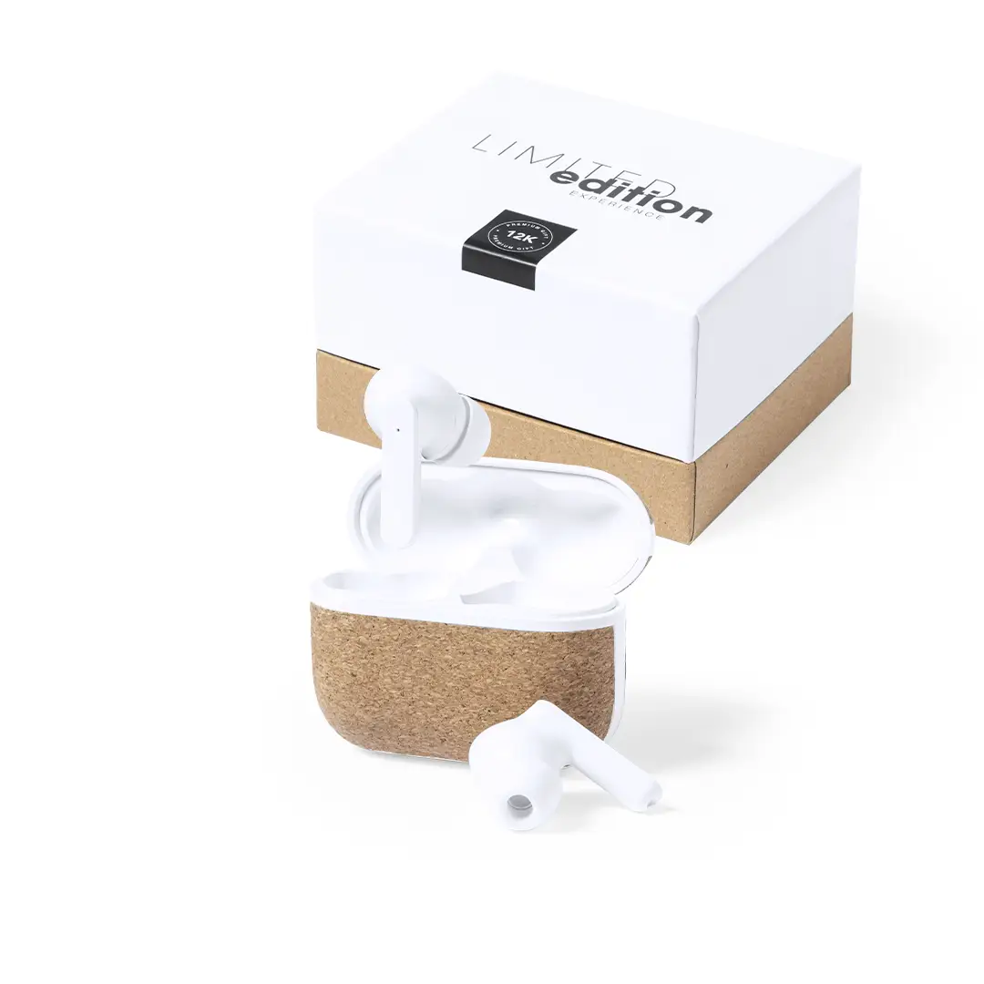 Auriculares intraurales de diseño exclusivo Limited Edition. Con conexión Bluetooth 5.0, función manos libres y en elegante acabado de color blanco. De diseño ergonómico y con batería de 30 mAh. Incluyen botón de control táctil integrado en el auricular y luz LED de estado de carga. Base de carga a juego, con batería de 300mAh y recubierta en corcho natural, con cable de carga Tipo C incluido. Disponible manual de instrucciones en español e inglés.Presentación en estuche Limited Edition Experience, de diseño único y protegido por derechos de propiedad industrial. Incluida tarjeta en cartón reciclado con descripción Limited Edition.De la perfecta combinación entre exclusividad y diseño nace Limited Edition, una colección especial de ideas promocionales de edición limitada. Un nuevo concepto, inspirado en la fusión de artículos premium con las últimas tendencias, en tiradas de unidades limitadas, y ofreciendo una experiencia de regalo única, exclusiva e inolvidable.Fabricado conforme a los estándares RoHS y en cumplimiento con los siguientes requisitos de seguridad:Sistema de protección contra sobrecalentamiento.Sistema de protección contra sobrecarga.Sistema de bloqueo para evitar cortocircuitos.