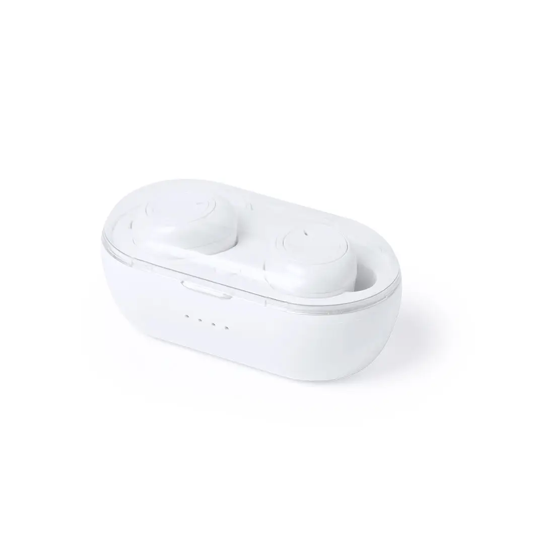 Auriculares intraurales de conexión Bluetooth 5.0 y diseño minimalista en elegante color blanco. De diseño ergonómico, incluyen panel de control integrado en en auricular, con estuche y base de carga a juego. Función manos libres y recargables, con cable micro USB incluido. Presentados en estuche individual de lujo con tapa transparente de bisagra. Presentados en atractiva caja de diseño.