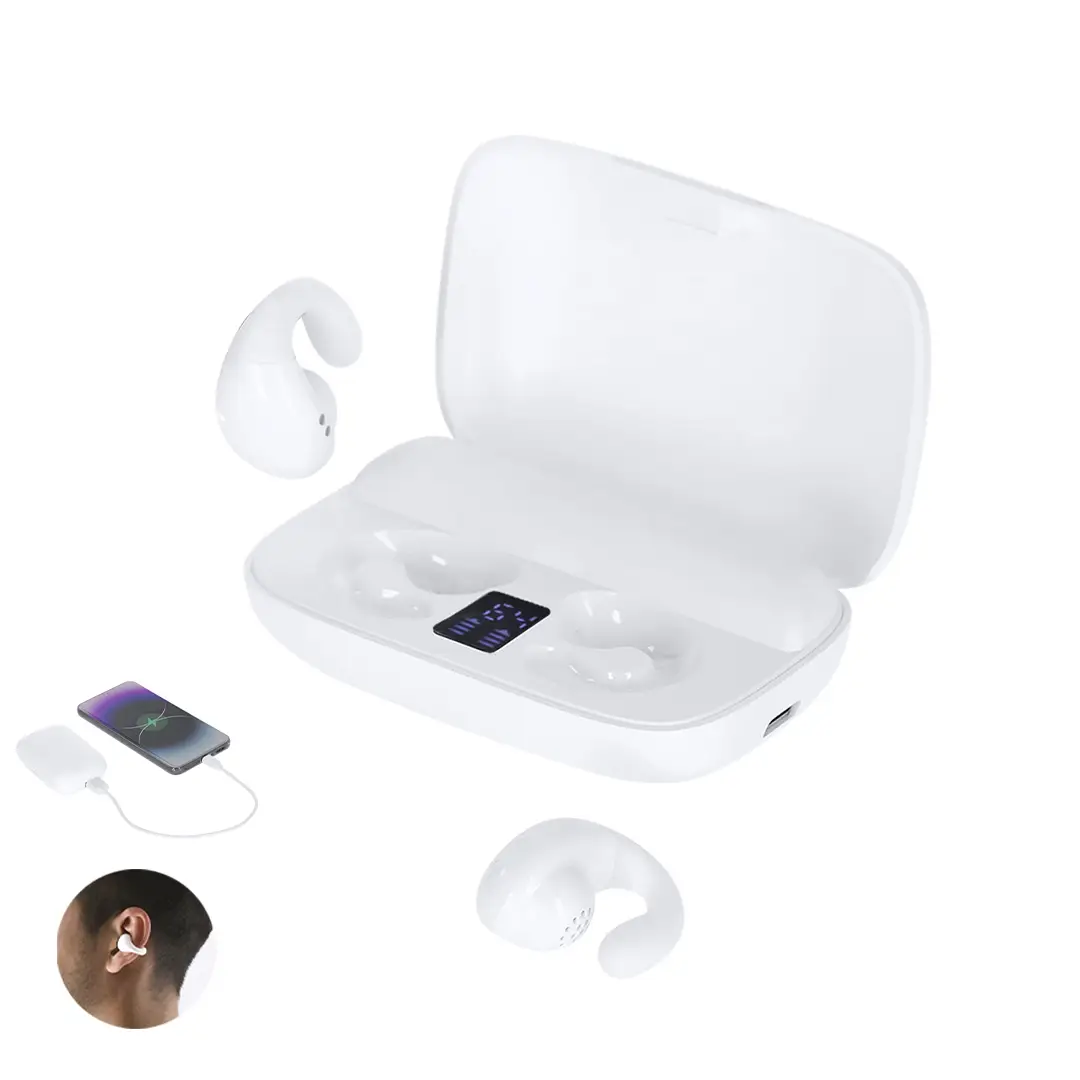 Auriculares open ear con power bank, diseñados para un ajuste perfecto y cómodo gracias a su práctico clip de suave silicona. Estos auriculares ofrecen una experiencia auditiva sin molestias, permitiendo disfrutar de la música o llamadas con total comodidad. Conexión Bluetooth 5.4 y función manos libres. Botón de control táctil integrado en el auricular. Incluye base de carga a juego con función power bank de 1200mAh de batería, conexión Tipo C de entrada y salida USB, cable de carga incluido (Tipo C). Incluye pantalla interior del estado de batería. Las capacidades mostradas en todas nuestras baterías auxiliares externas son reales, incorporando todas ellas baterías de grado A y no recicladas, con una vida útil de al menos 500 ciclos de carga y según normativa CE.Además, están fabricadas conforme a los estándares RoHS y en cumplimiento con los siguientes requisitos de seguridad:Sistema de protección contra sobrecarga del power bank.Sistema de protección contra descarga completa que proporciona una mayor durabilidad del power bank.Sistema de bloqueo para evitar cortocircuitos.Sistema de transferencia de carga constante, acorde con la capacidad del dispositivo de destino.