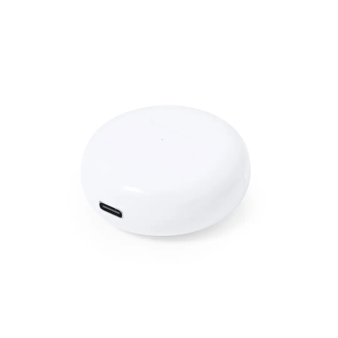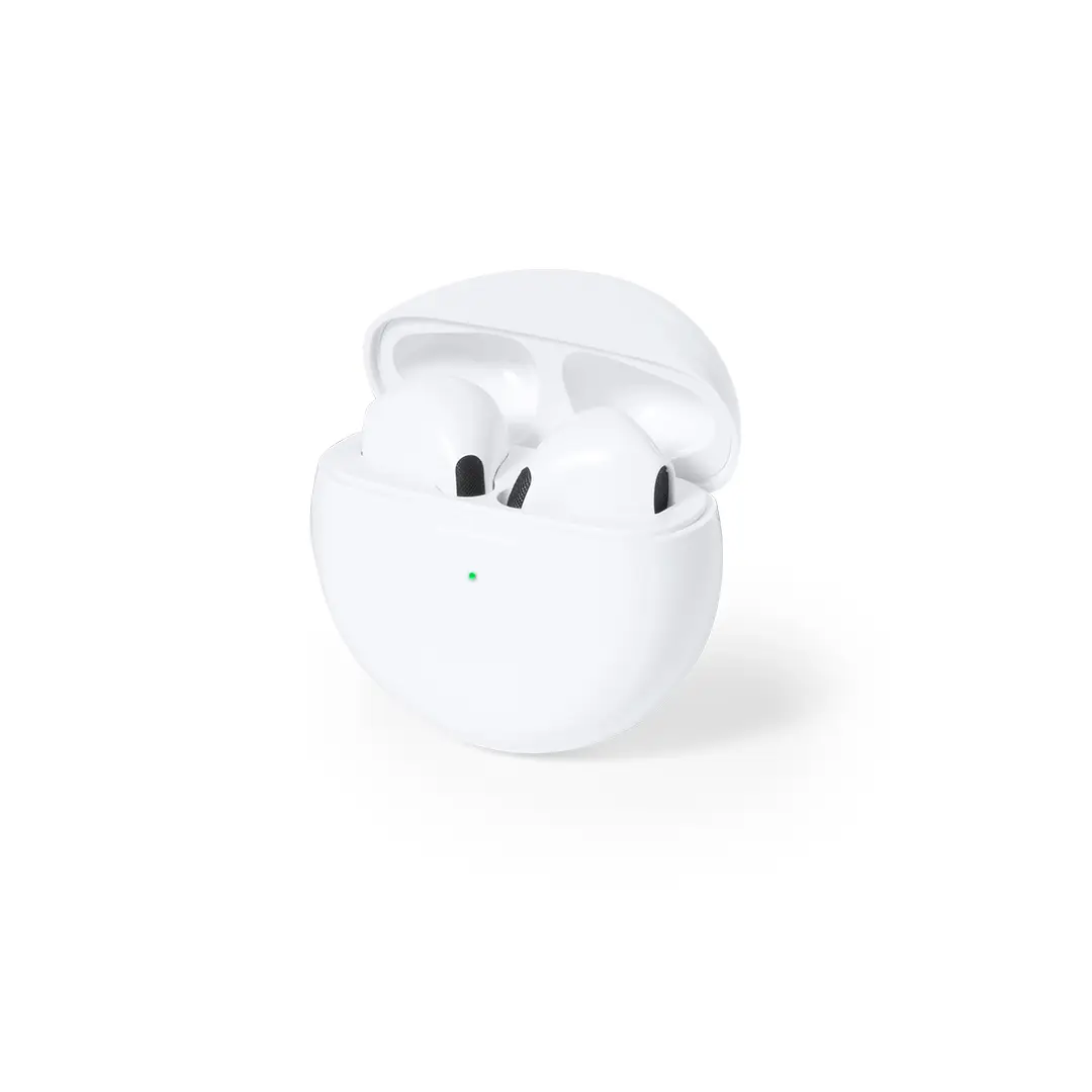 Auriculares intraurales con conexión Bluetooth 5.3 y función manos libres. De diseño ergonómico, incluyen botón de control táctil integrado en el auricular, con base de carga a juego. Batería integrada de 200 mAh y presentados en caja individual de diseño kraft. Manual de instrucciones en español e inglés.