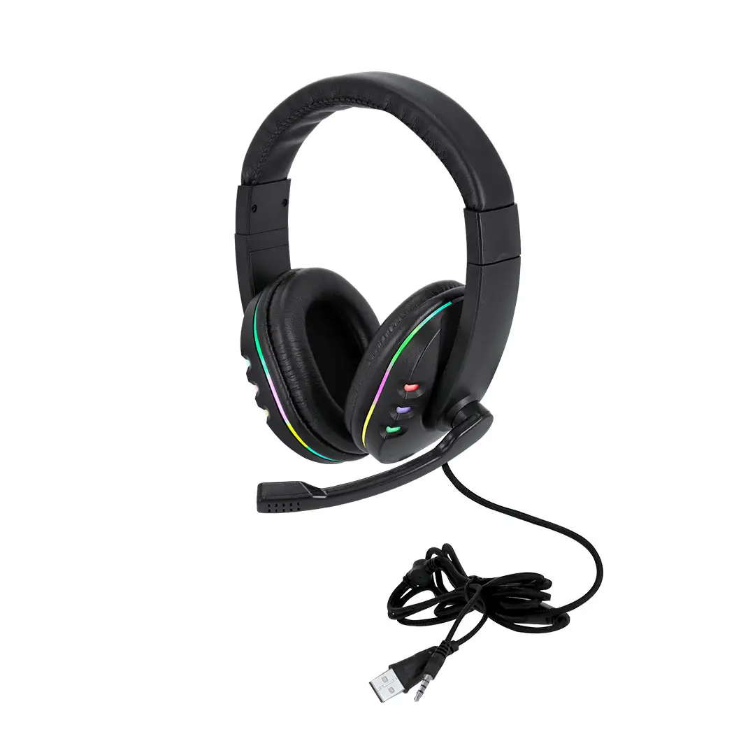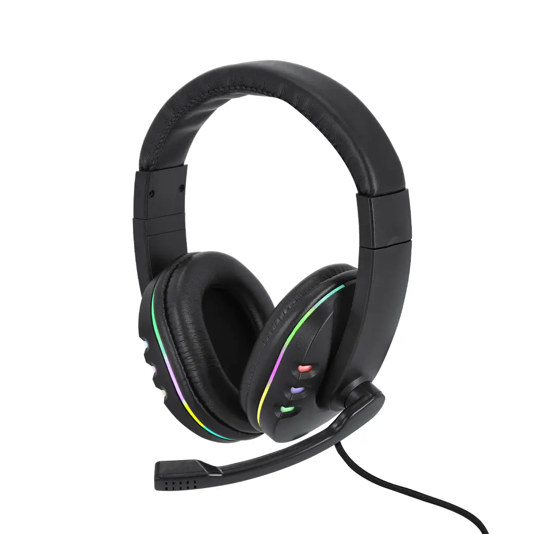 Auriculares gamer diseñados para una experiencia de juego inmersiva. Diseño de diadema con sonido envolvente y retroiluminados con luz LEDs multicolor combinando efectos intermitentes automáticos. Micrófono integrado y cable de 160cm con control de volumen integrado y doble conexión (USB y Jack 3,5 mm).