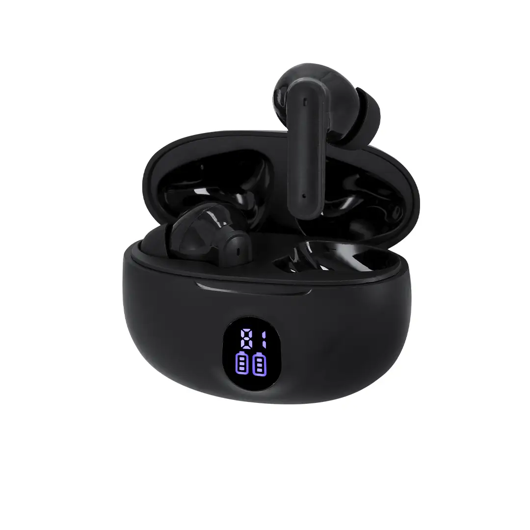 Auriculares intraurales con conexión Bluetooth 5.4, con función manos libres y cancelación de ruidos. De diseño ergonómico, incluyen botón de control táctil integrado en el auricular, con base de carga a juego y pantalla exterior del estado de batería por auricular. Batería integrada de 230 mAh. Manual de instrucciones en español e inglés.