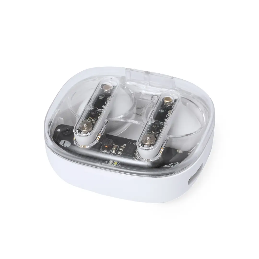 Auriculares intraurales en distintivo diseño transparente. Conexión Bluetooth 5.3 y gran autonomía . De diseño ergonómico, incluyen botón de control táctil integrado en el auricular, con base de carga a juego e indicadores de estado de carga. Función manos libres. Puerto de carga con entrada Tipo C (cable incluido). Presentados en caja individual de diseño kraft y en bolsa reciclada.