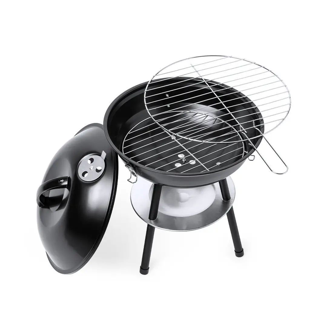 Barbacoa fabricada en resistente acero al carbono de acabado en negro. Tapa con cómoda asa y orificios de ventilación, con parrilla metálica, plato antigoteo y pies antideslizantes. Presentada en atractiva caja de diseño.