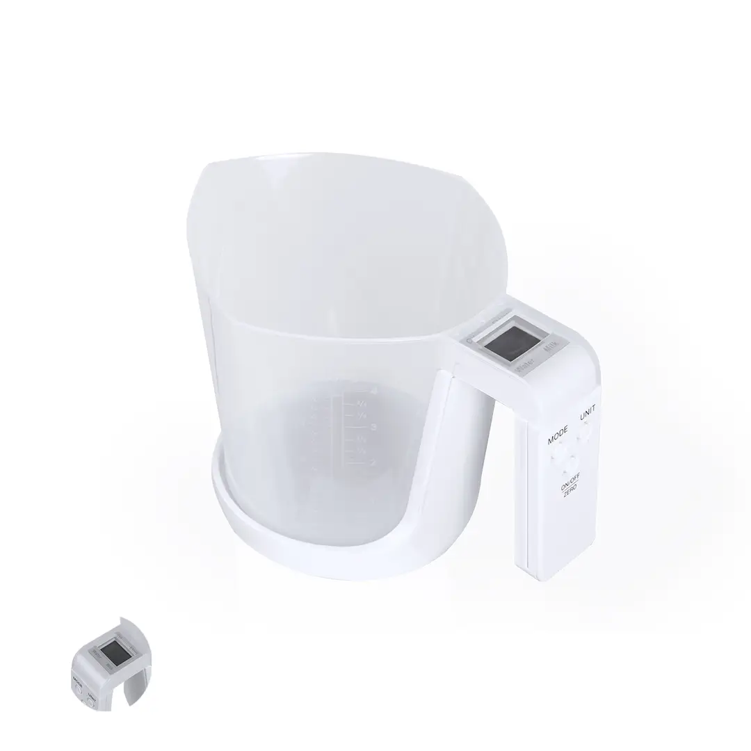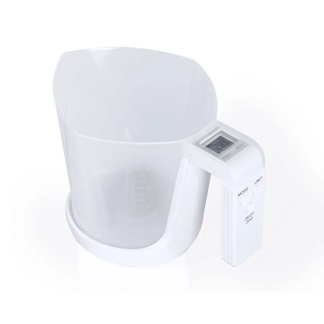Báscula con jarra medidora integrada, fabricada en resistente combinación de PP y ABS. Pantalla LCD con control por botones y función de tara, con capacidad máxima para 5 kg de peso y válida para medir elementos líquidos o sólidos.Incluye Jarra medidora de 1L de capacidad, con multitud de opciones y vertedor para evitar derrames:-1L, con medidor lateral en tramos de 50 ml.-32 oz, con medidor lateral en tramos de 2 oz. -Medición rápida en volumen de tazas.Funciona con pila de botón (incluida) y viene presentada individualmente en caja.