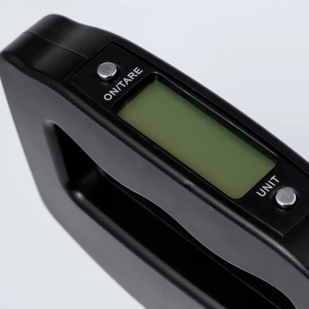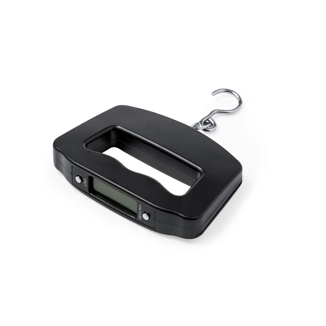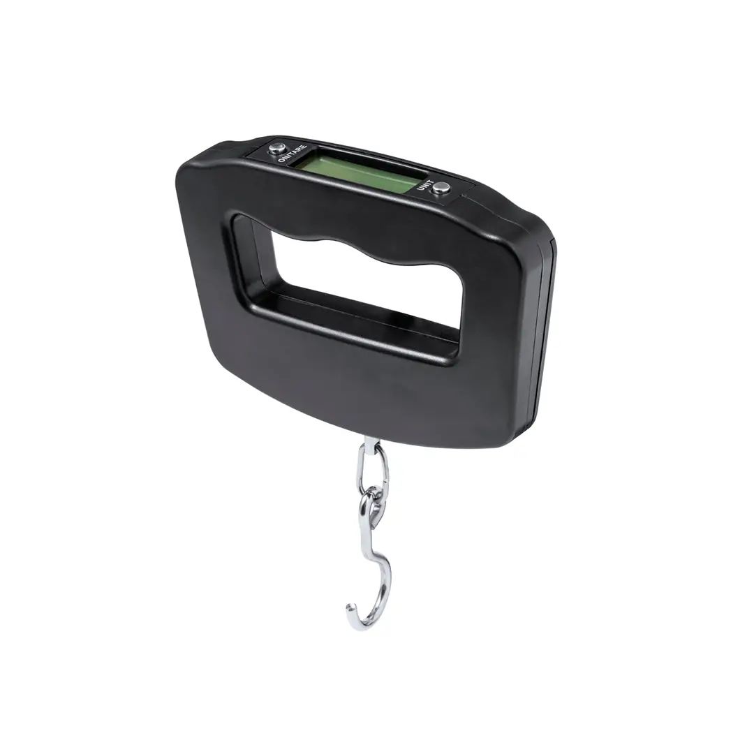 Báscula digital de mano portátil. De diseño ergonómico para adaptarse a la mano y facilitar la visualización de su pantalla LCD. Con botón ON/OFF, función TARA, y varias unidades de medida: gramos (g), kilogramos (kg), libras (lb) y onzas (oz). Con gancho metálico para facilitar el pesaje de diversos objetos y un peso máximo de 50kg. Incluye instrucciones en español e inglés y está alimentada por 2 pilas AAA (no incluidas). Presentada individualmente en caja de diseño kraft.