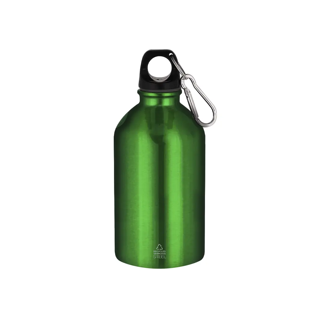 Bidón con 500 ml de capacidad. Fabricado en Acero Inoxidable Reciclado con acabado metalizado. Tapón negro de cierre a rosca para garantizar un sellado óptimo. Incluye mosquetón metálico que facilita su transporte. Con distintivo Acero Inoxidable Reciclado.
