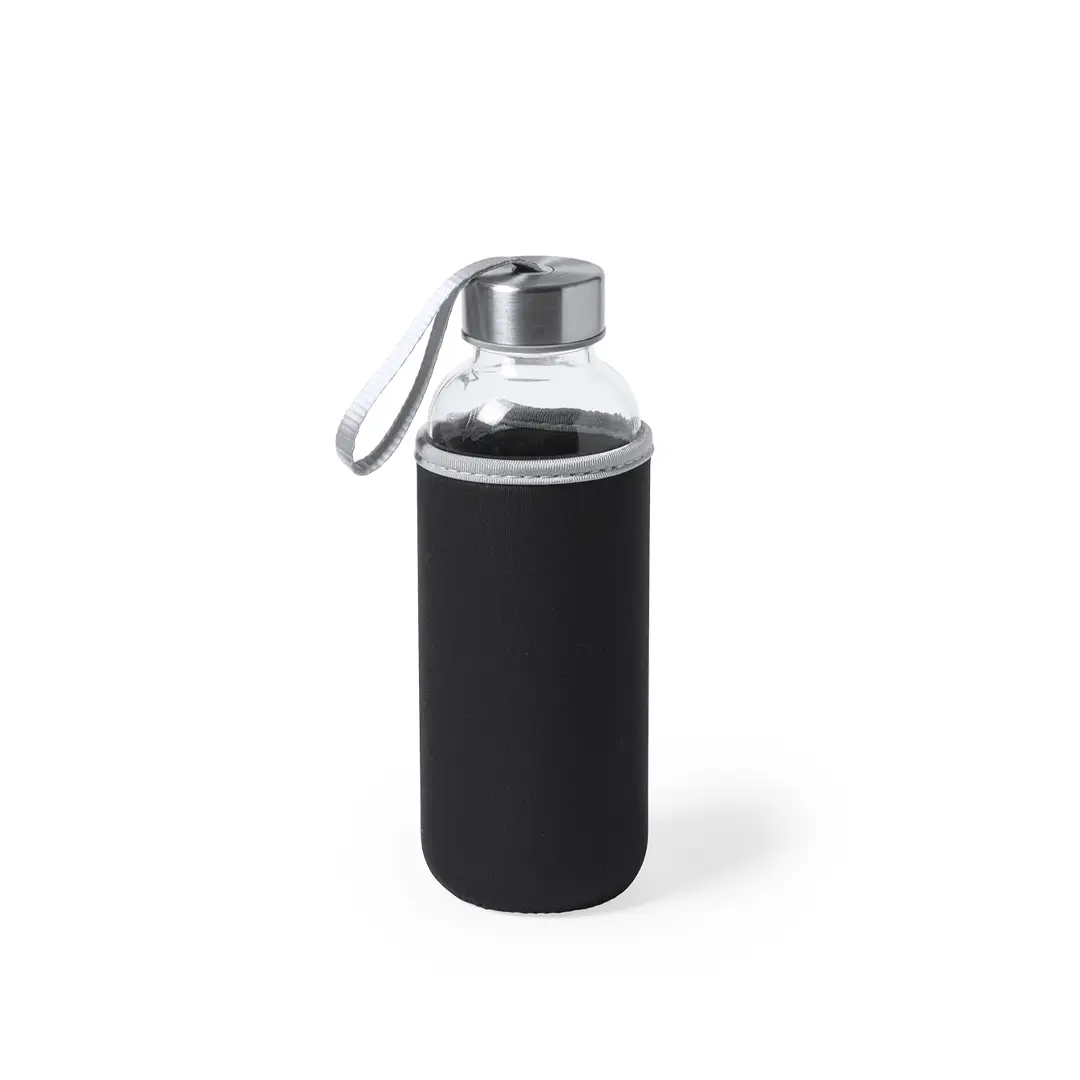 Bidón de cristal de 420 ml de capacidad. Con tapón de seguridad a rosca y practica cinta de transporte, cuenta con una elegante funda de neopreno en vivos colores. Presentado individualmente en una caja de diseño.