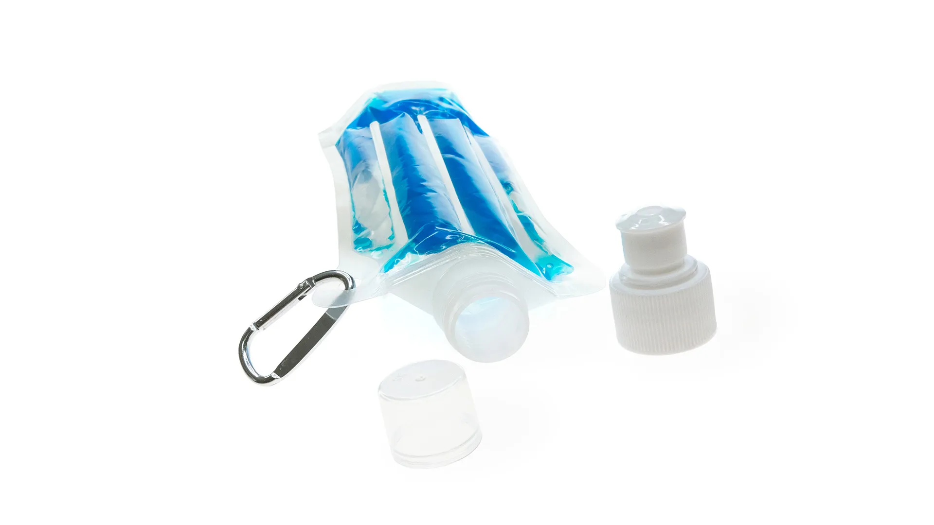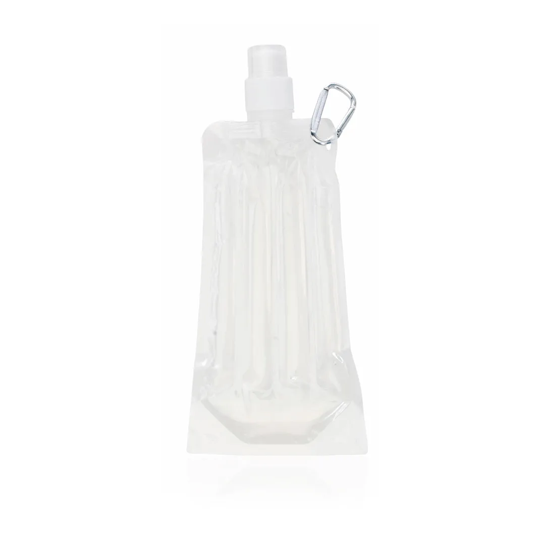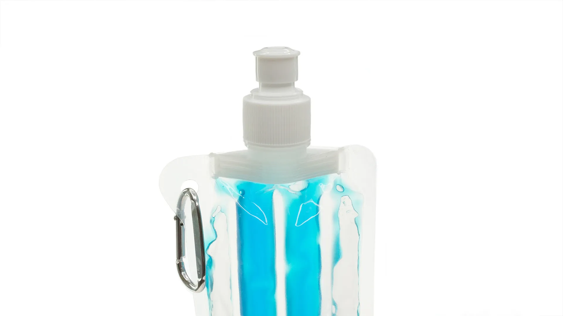 Bidón enfriador de 400ml de capacidad con cuerpo acabado en PET transparente y líquido refrigerante en vivos colores. Con tapón de seguridad a rosca y mosquetón metálico de transporte.