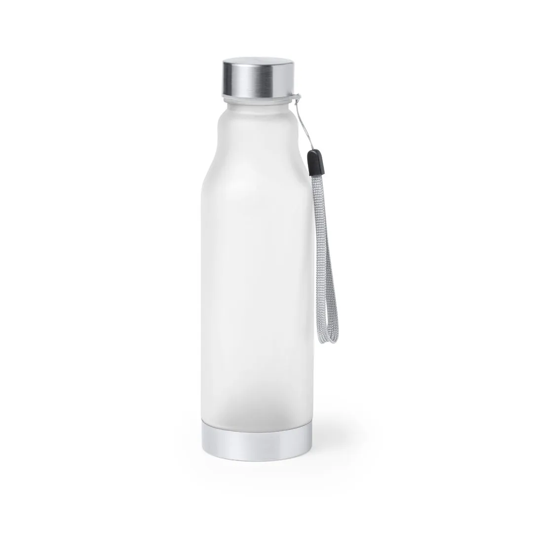 Bidón de 600ml de capacidad. Libre de BPA, con cuerpo de RPET elaborado a partir de plástico reciclado, para así fomentar la reutilización de residuos plásticos y contribuir a la sostenibilidad del planeta. Tapón a rosca en acero inox, con cordón de transporte y base a juego. Disponible en variada gama de colores.