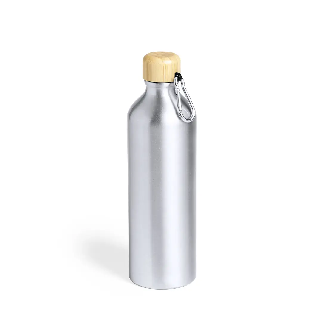 Bidón de línea nature y 800 ml de capacidad. Cuerpo en aluminio de acabado mate y tapón de bambú con mosquetón a juego para fácil transporte. Libre de BPA y presentado en atractiva caja de diseño eco.