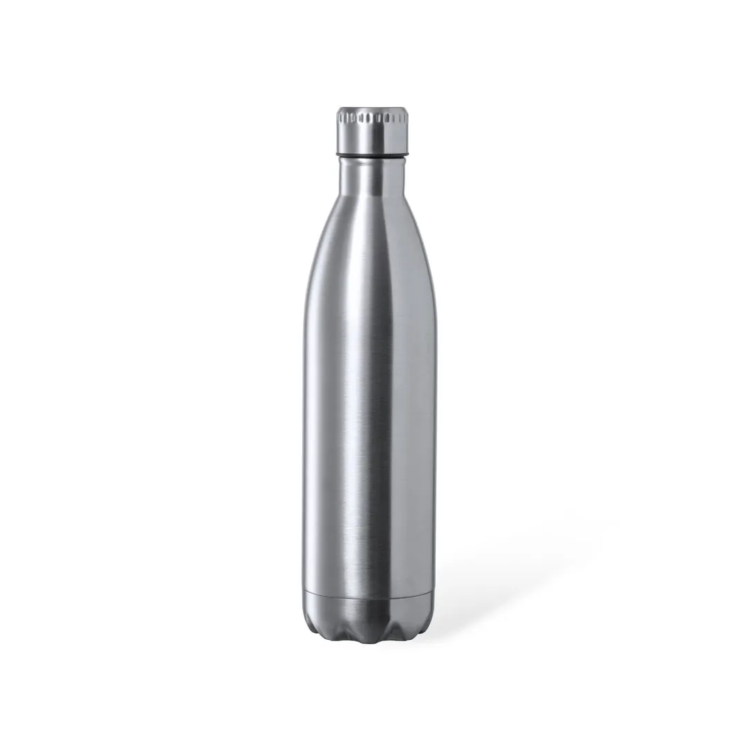 Bidón de 1 l de capacidad, fabricado en acero inox de acabado brillo. Con tapón a rosca en acero inox a juego, libre de BPA. Presentado en caja individual de diseño kraft.