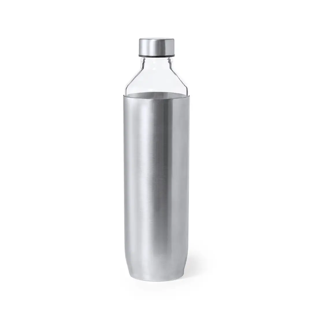 Bidón de diseño en alta calidad, de 850 ml de capacidad. Fabricado en cristal de borosilicato, que ofrece una resistencia, estética y durabilidad excepcionales, alargando su vida útil y pudiendo ser reutilizado infinidad de veces. Tapón y funda del cuerpo del bidón en acero inox. Presentado en atractiva caja de diseño.