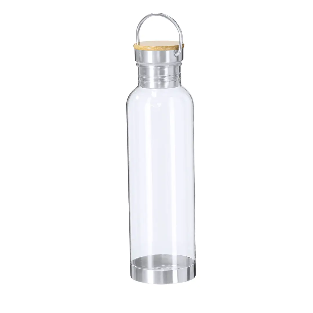 Bidón fabricado en RPET con capacidad de 800 ml. Cuerpo en RPET transparente. Tapón a rosca equipado con asa de trasporte en acero inoxidable con tapa en bambú y base en acero inoxidable. El material RPET se elabora a partir de plástico reciclado, para así fomentar la reutilización de residuos plásticos y ayudar a la sostenibilidad del planeta. Materiales como el Bambú fomentan la utilización de materias primas naturales reduciendo las emisiones contaminantes. Además, el bambú proviene de una planta de gran resistencia y versatilidad, con crecimiento y regeneración rápida, siendo una excelente alternativa al uso de madera tradicional.