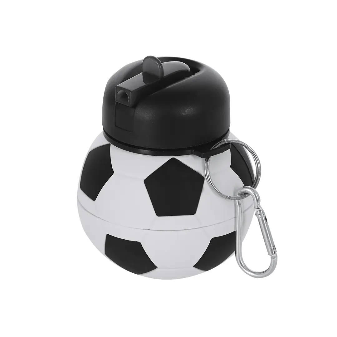 Bidón plegable con diseño de balón de futbol con capacidad de 550 ml. Incluye anilla metálica con mosquetón para práctico transporte. Tapa de rosca con boquilla. Libre de BPA.