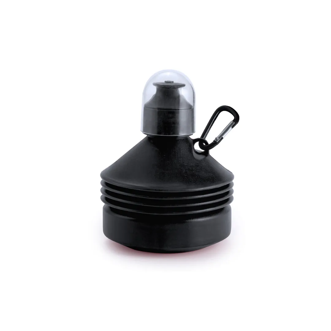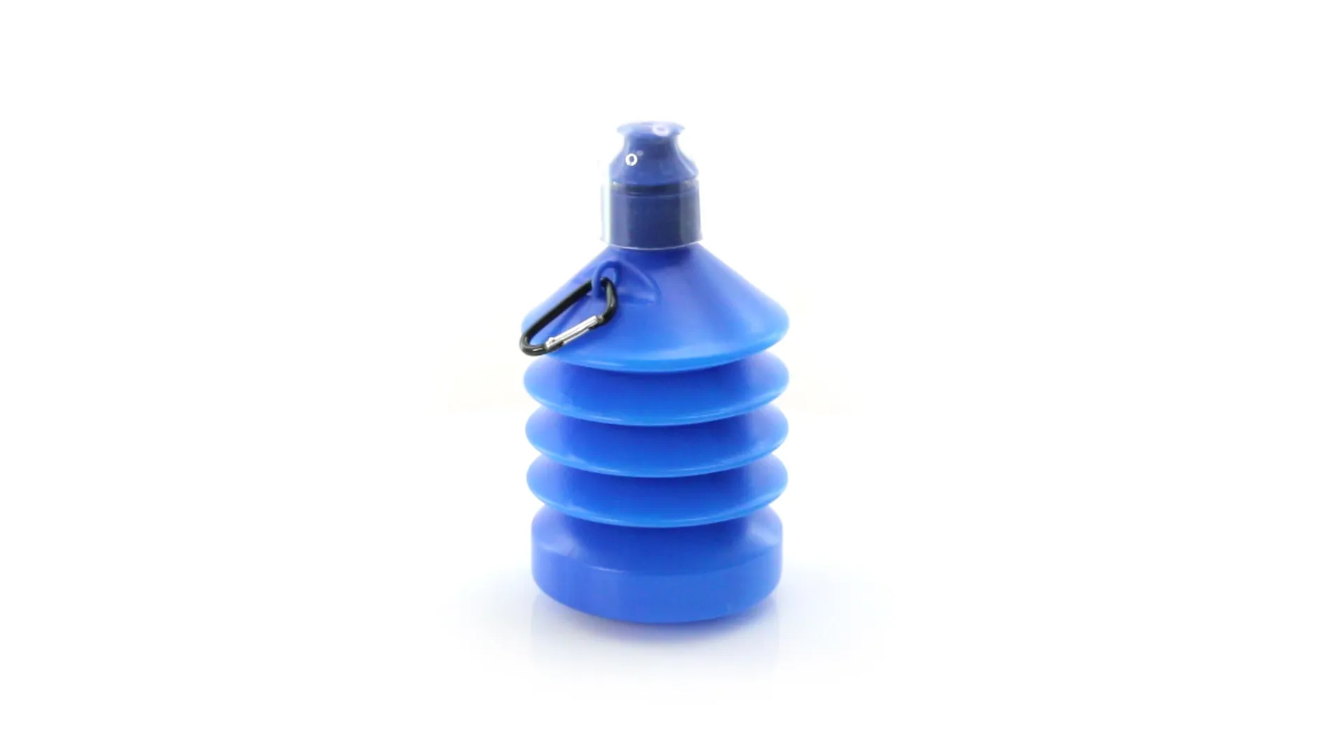 Bidón plegable de 570ml de capacidad con cuerpo ergonómico acabado en PE de vivos y variados colores. Dosificador de seguridad con capucha de cierre y mosquetón metálico de transporte.