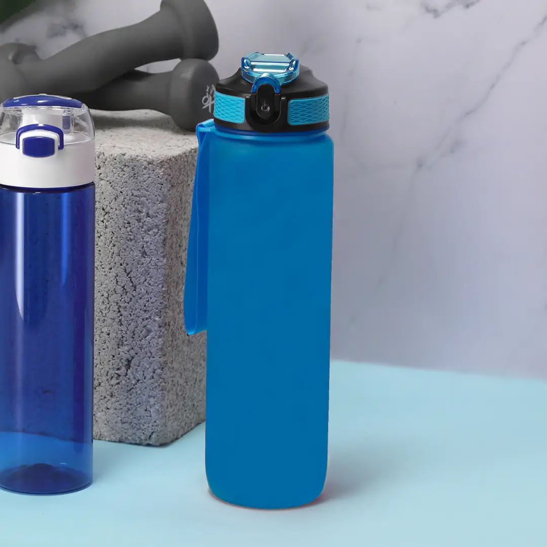 Bidón de 1L de capacidad, fabricado en resistente PETG y en acabado translúcido mate.Con indicador de capacidad en litros y onzas, junto con frases motivadoras que invitan a mantener una adecuada hidratación. Con tapón negro de rosca. Incluye dosificador con cierre de seguridad y cómoda cinta de transporte. Libre de BPA.