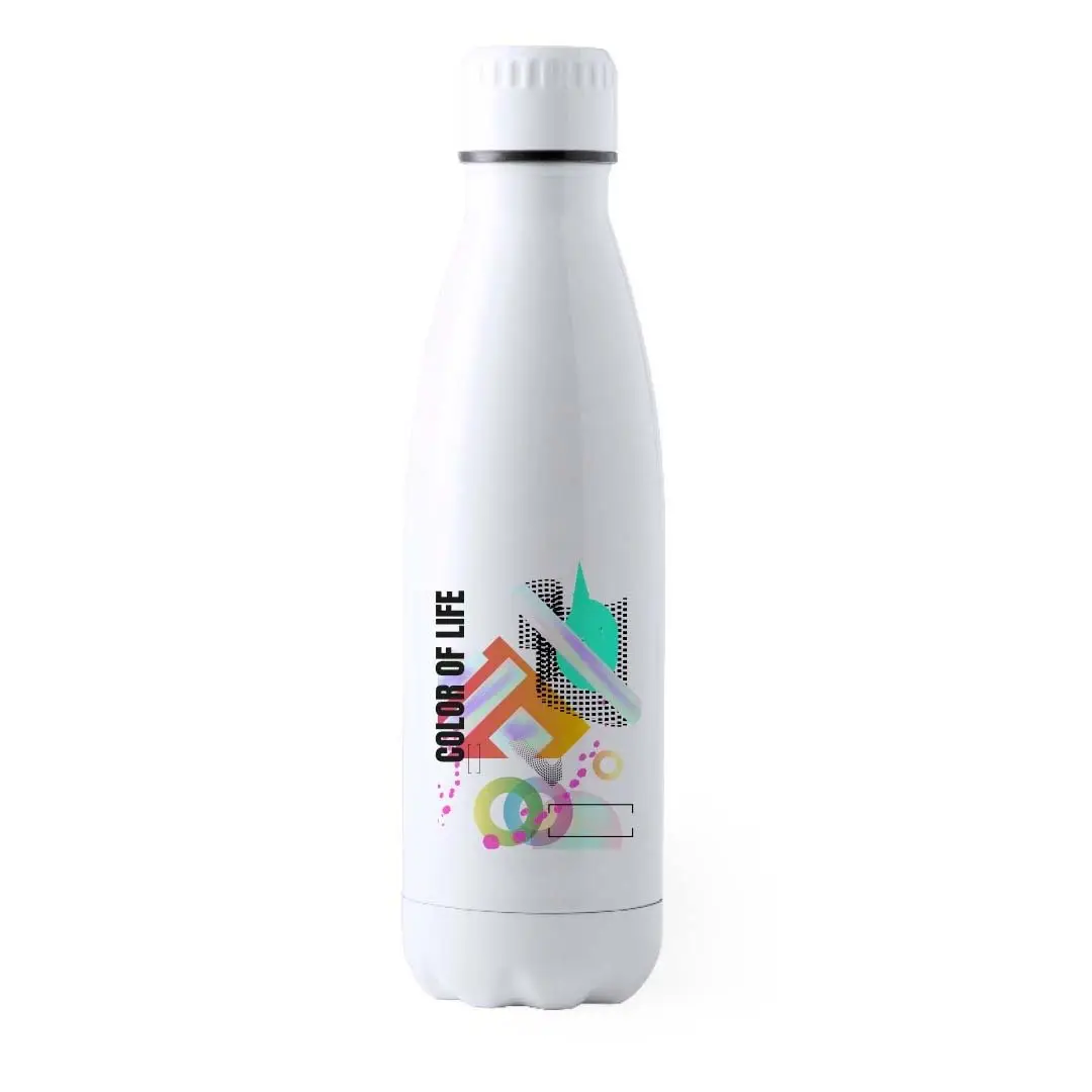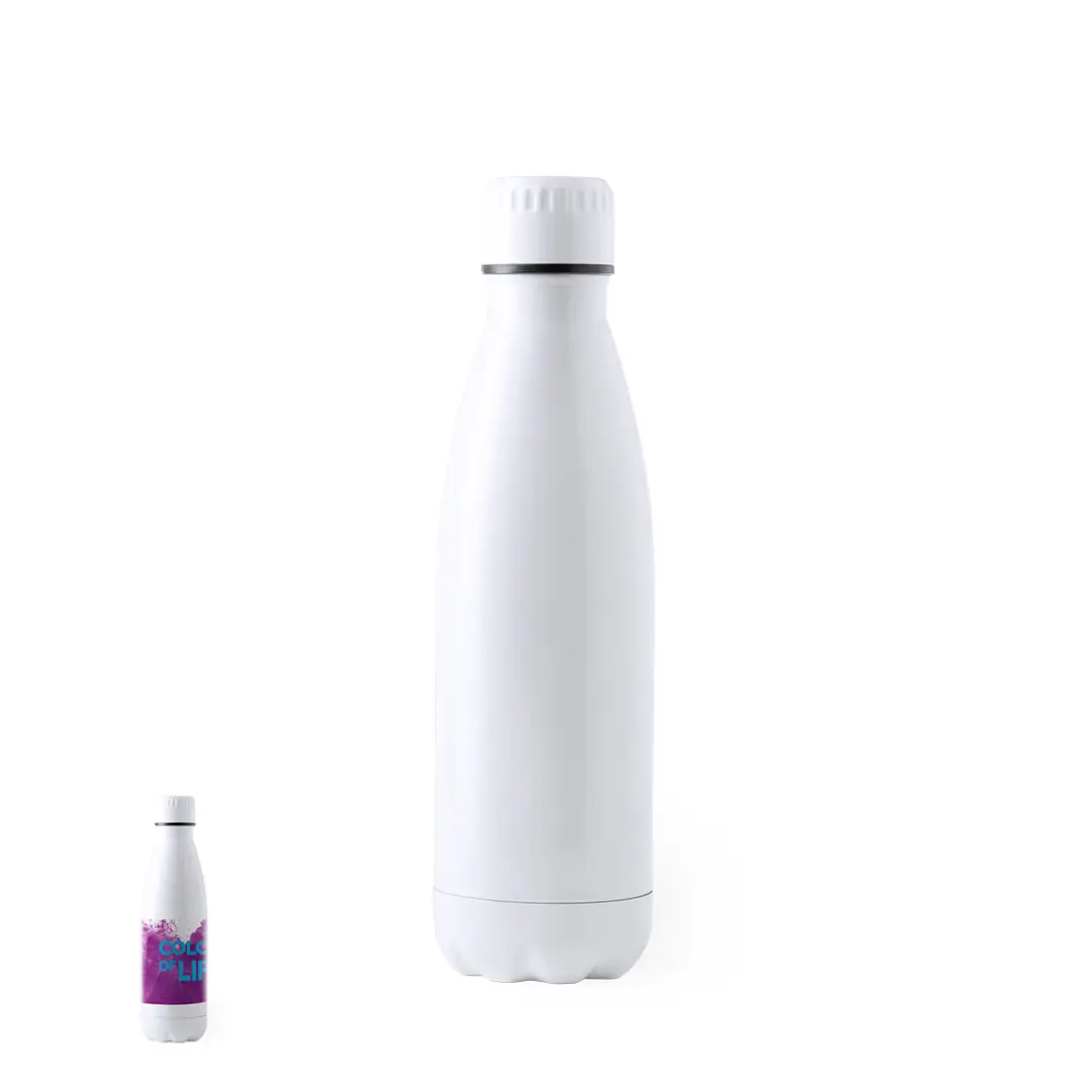 Bidón para sublimación de 700ml de capacidad con cuerpo acabado en acero inox en color blanco brillo. Con tapón de seguridad. Presentado en atractiva caja de diseño.