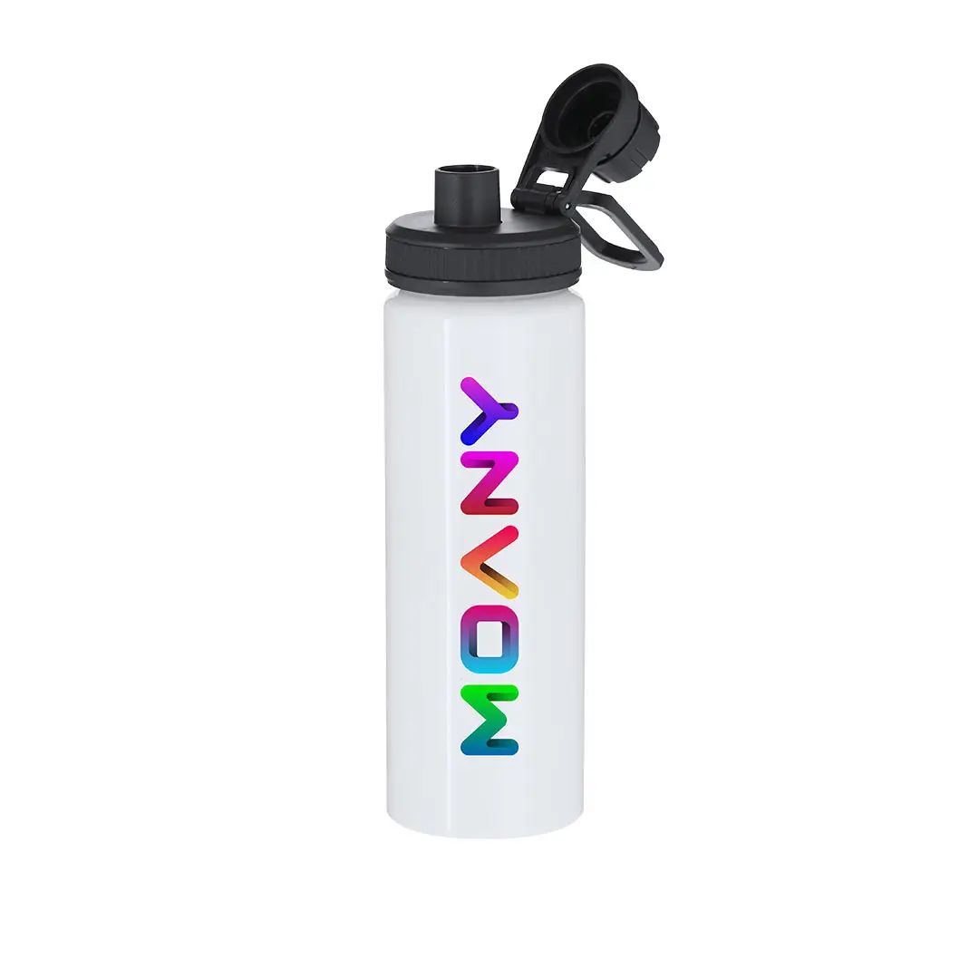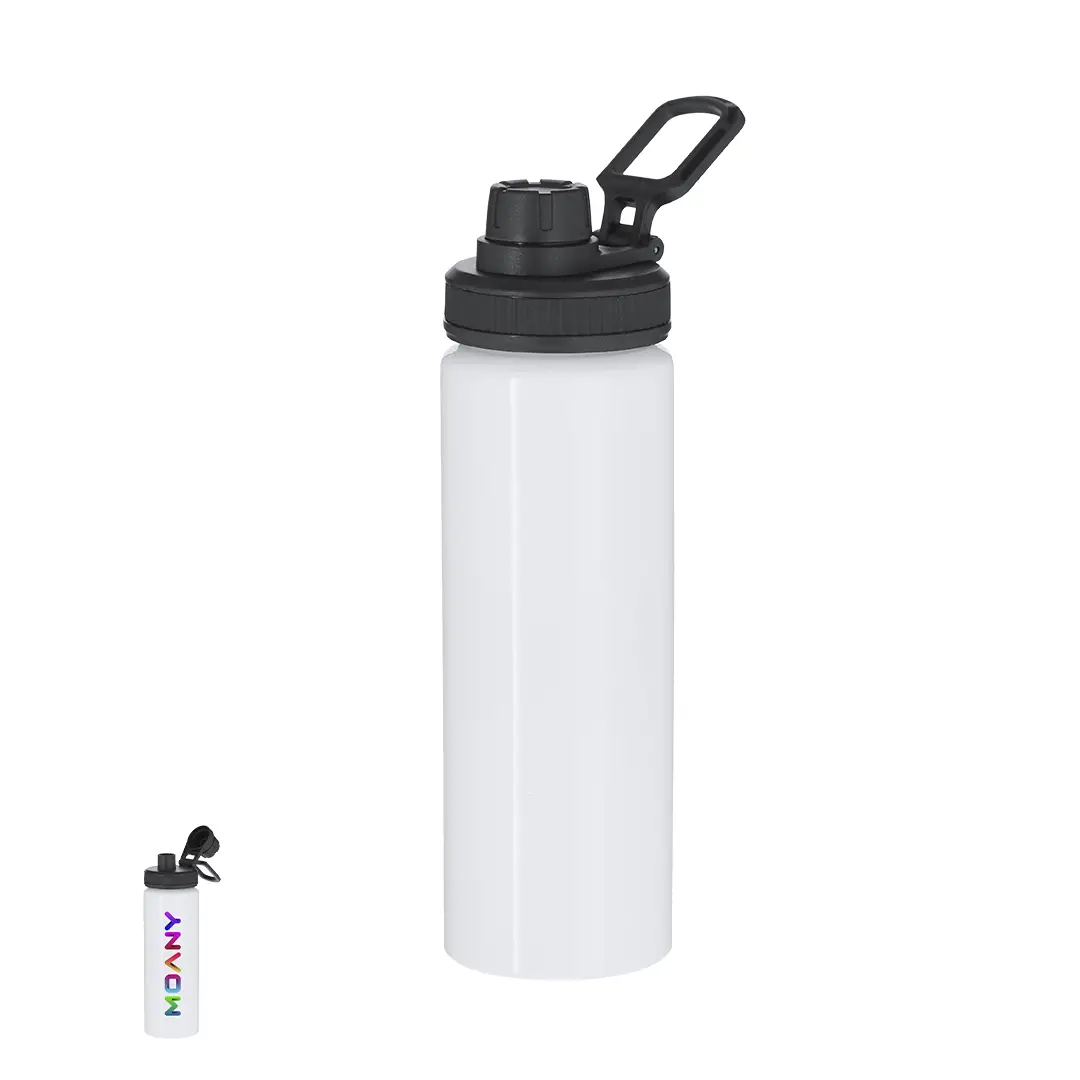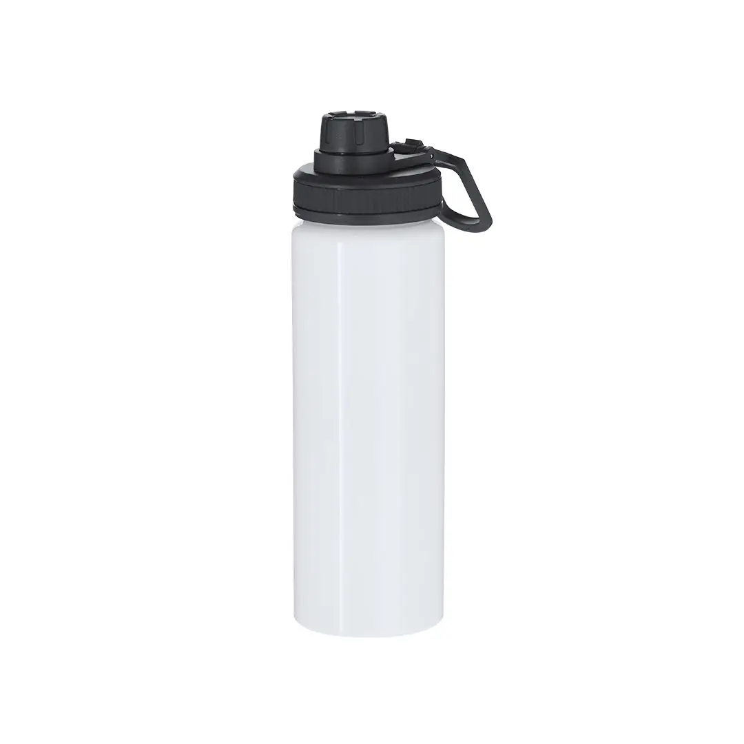Bidón de aluminio con 800 ml de capacidad. En color blanco brillante, especialmente diseñado para la sublimación. Incluye tapadera color negro con sistema de cierre a rosca, agarre de silicona gris para un óptimo sellado, dosificador y asa para transporte ajustable. Libre de BPA.