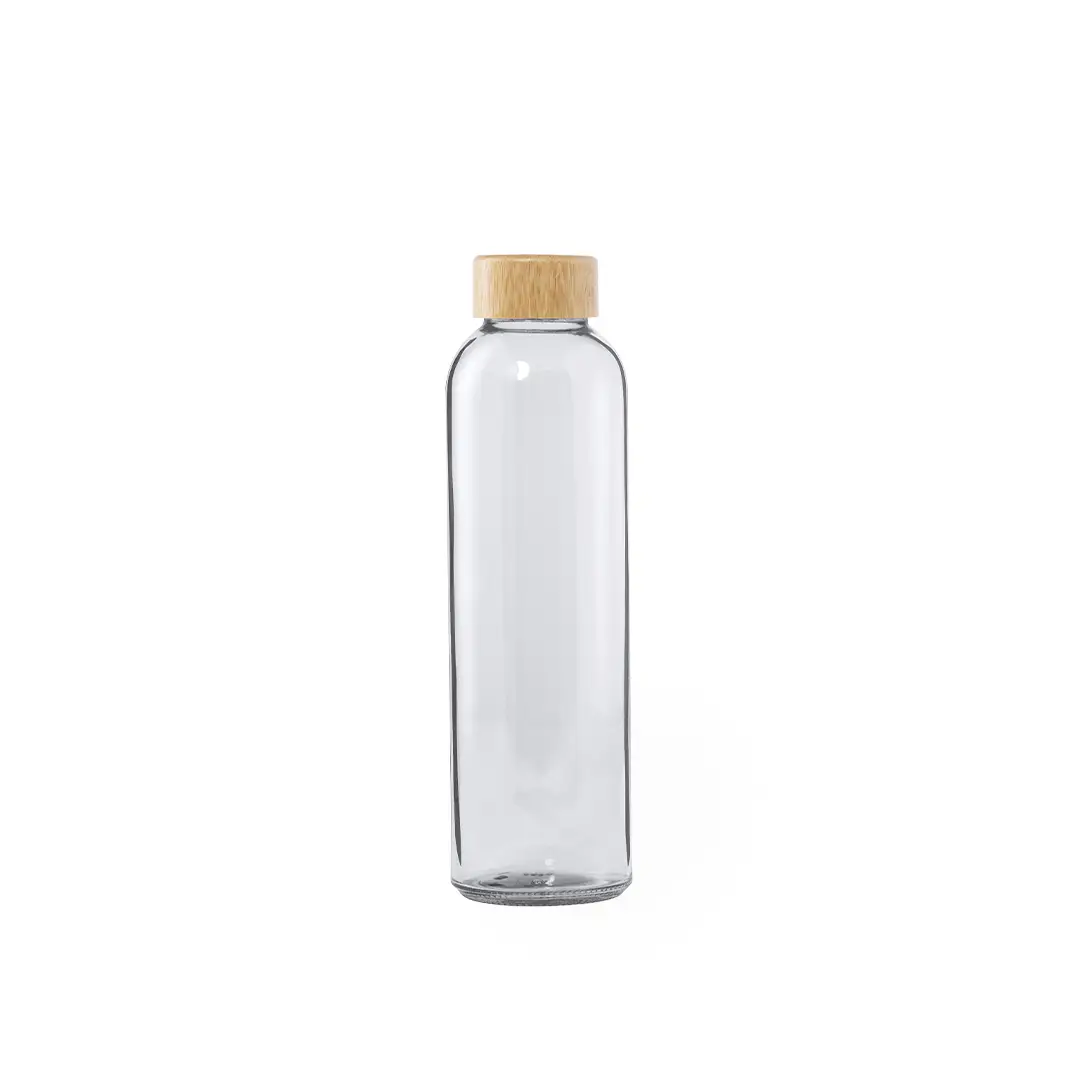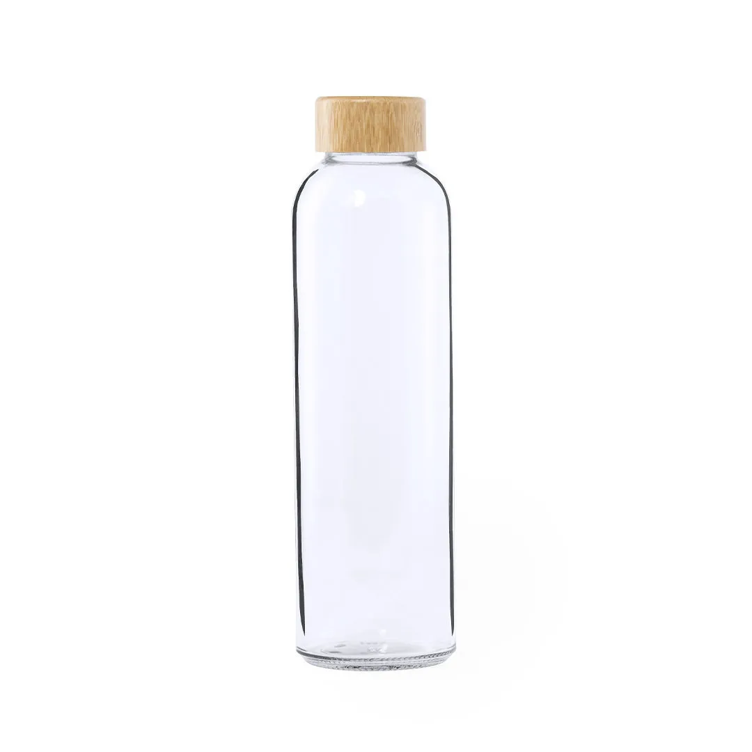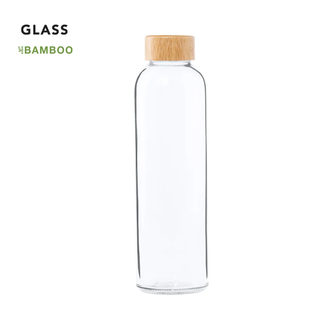 Bidón transparente de cristal de 500 ml de capacidad, con tapón a rosca en bambú y libre de BPA. Presentado en atractiva caja de diseño kraft.