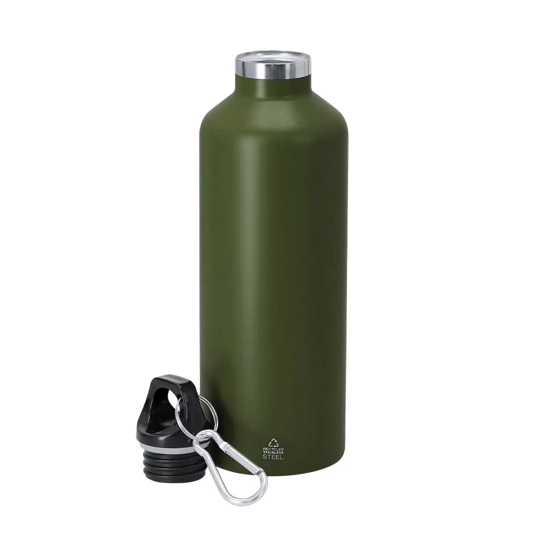 Bidón térmico con 500 ml de capacidad con doble pared en acabado mate. Fabricado en Acero Inoxidable Reciclado con acabado metalizado. Tapón negro de cierre a rosca para garantizar un sellado óptimo. Incluye mosquetón metálico que facilita su transporte. Con distintivo Acero Inoxidable Reciclado.