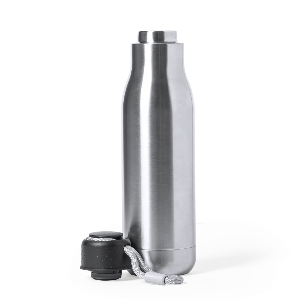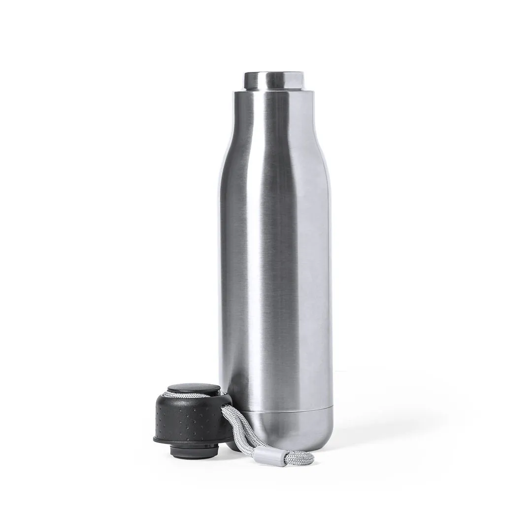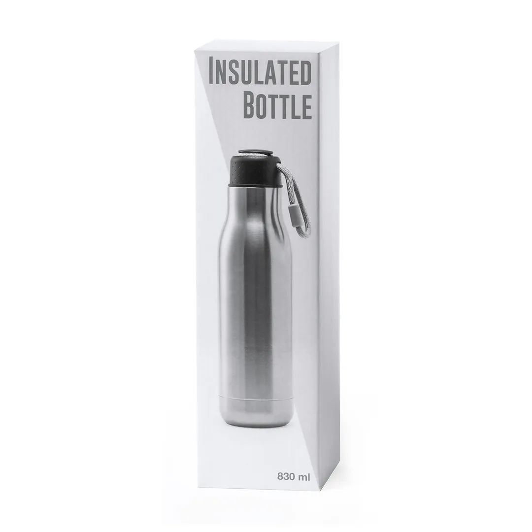 Bidón térmico de acero inox y doble pared de 830ml de capacidad y de acabado brillo. Tapón de seguridad libre de BPA y presentado en atractiva caja de diseño.