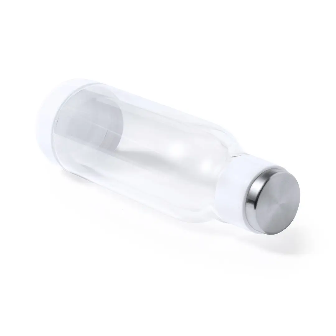 Bidón térmico de doble capa, de original diseño en alta calidad y de 500 ml de capacidad. Fabricado en cristal de borosilicato, que ofrece una resistencia, estética y durabilidad excepcionales, reduciendo así el consumo de productos de usar y tirar. Innovador cuerpo transparente que permite ver el interior en combinación con color blanco, fabricado con materiales de alto poder aislante. Presentado en atractiva caja de diseño.