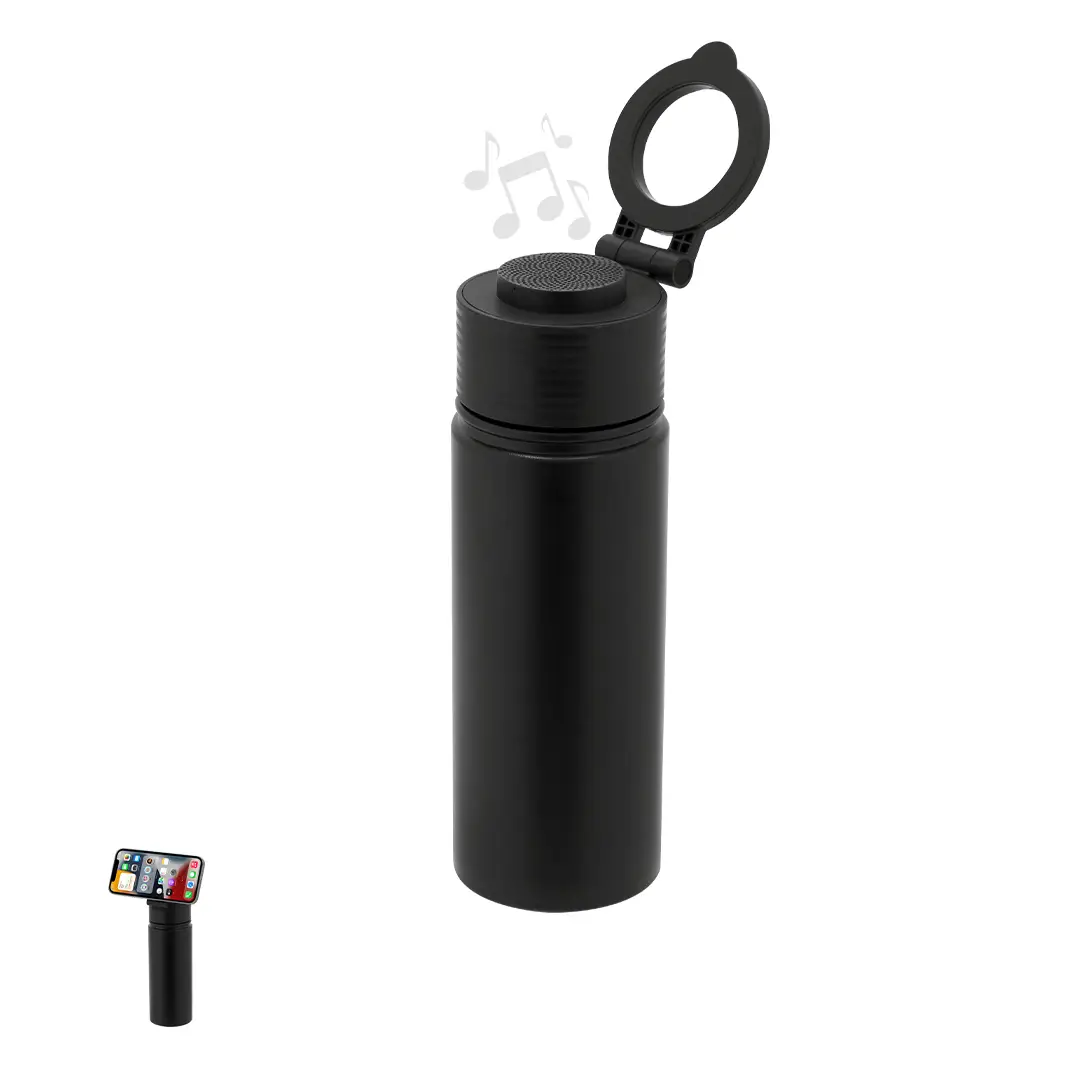 Bidón térmico con Altavoz Bluetooth 5.4 de 3W integrado. Con 500 ml de capacidad y fabricado en acero inox de doble pared, asegurando una durabilidad máxima y un excelente mantenimiento de la temperatura de las bebidas, ya sean frías o calientes. Tapadera con sistema de cierre de rosca y libre de BPA, e incluye sujeción orientable para smartphone con tecnología Magsafe. El altavoz Bluetooth de 600 mAh integrado en el tapón es fácilmente extraíble gracias a su sistema de rosca.