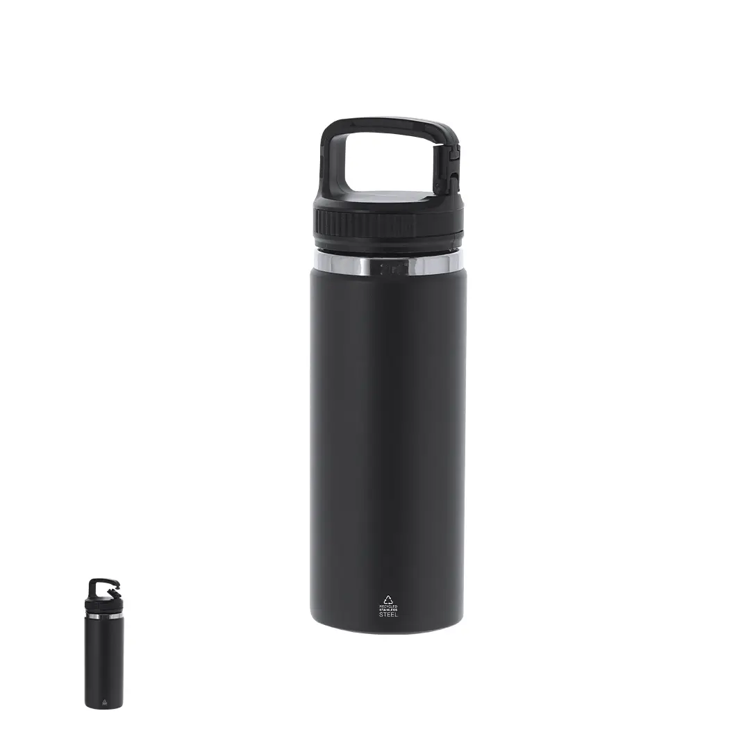 Bidón térmico de 550 ml de capacidad, fabricado en acero inox reciclado de doble pared. Cuenta con un asa funcional con doble función de mosquetón, que facilita un transporte cómodo y versátil. Con tapadera a rosca y base en color mate, complementada con un elegante aro decorativo en plata. Libre de BPA.El acero es uno de los materiales más demandados y que puede encontrarse casi en todas partes, desde productos de uso diario a grandes construcciones. Con innumerables propiedades, entre las que cabe destacar la durabilidad y su alto grado de reutilización, convirtiéndolo en una alternativa muy valorada en soluciones de sostenibilidad. Debidamente tratado, permite obtener nuevos recursos de infinita utilización.