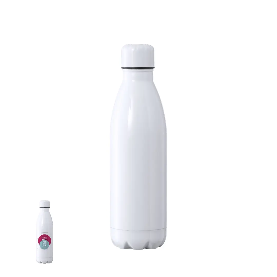 Bidón térmico de 500 ml de capacidad, fabricado en acero inox de doble pared y especialmente diseñado para marcaje en sublimación. De acabado blanco brillo y con tapón a rosca a juego, libre de BPA. Presentado en caja individual de diseño kraft.Disponible manual de instrucciones en español e inglés.