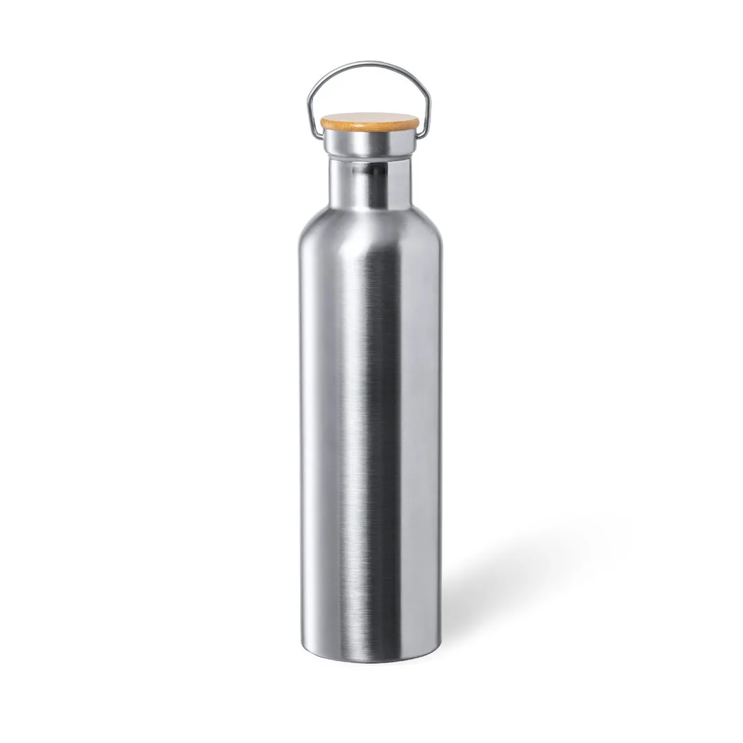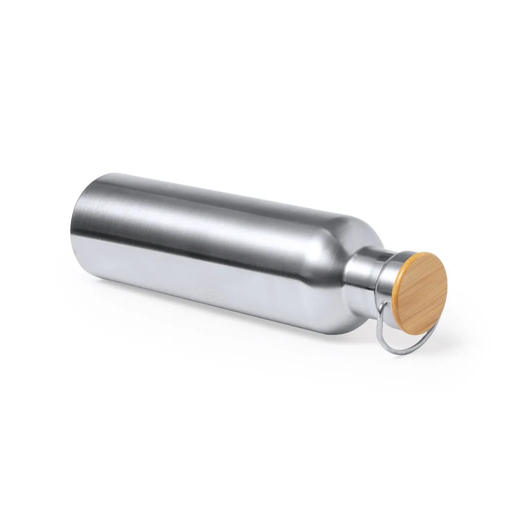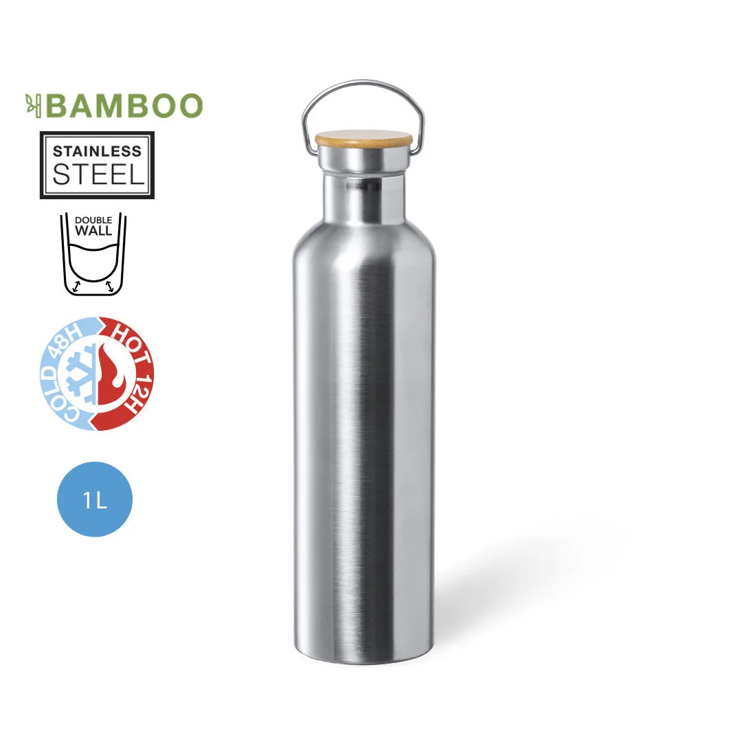 Bidón térmico de 1 l de capacidad, fabricado en acero inox de doble pared y acabado mate. Incluye original tapón a rosca en acero inox, con detalle de bambú y asa integrada. Libre de BPA y presentado en caja individual de diseño kraft.