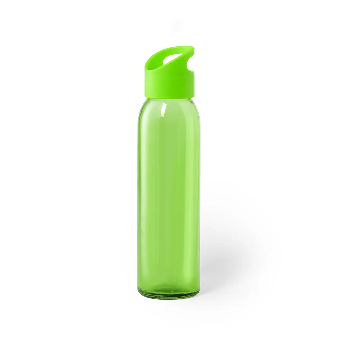 Bidón de 470ml de capacidad. Fabricado con cuerpo de cristal y disponible en variada gama de colores. Tapón a rosca en PP, libre de BPA, a juego. Presentado en caja individual de atractivo diseño.