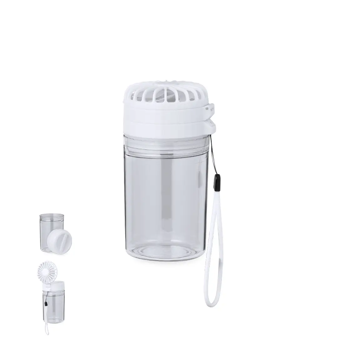 Práctico bidón con ventilador, fabricado en Tritan y de 350 ml de capacidad. Libre de BPA, con tapadera hermética de rosca que incluye un ventilador regulable en 3 niveles de intensidad y posición. Con batería de 1200 mAh y una tapadera extra para poder usar por separado. Incluye cordón para transportarlo fácilmente y viene presentado individualmente en caja kraft.