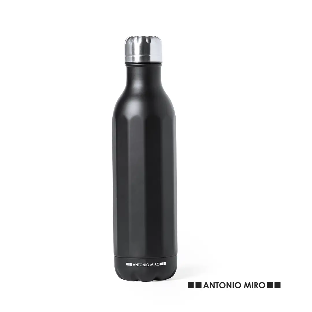 Bidón en acero inox de Antonio Miró. De 750ml de capacidad y sobrio acabado en negro satinado, con cuerpo prisma y logotipo de la marca en la base. Con tapón cromado a rosca y presentado en atractiva caja de diseño con logotipo de la marca.