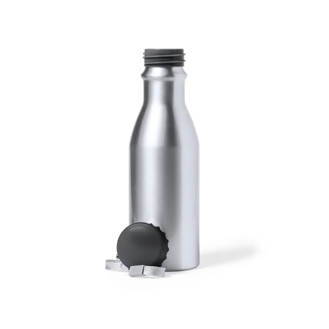 Bidón de 500 ml de capacidad, fabricado en aluminio de acabado brillo. Con original tapón chapineta en negro, a rosca y con cinta de transporte. Libre de BPA y presentado en caja individual de diseño kraft.