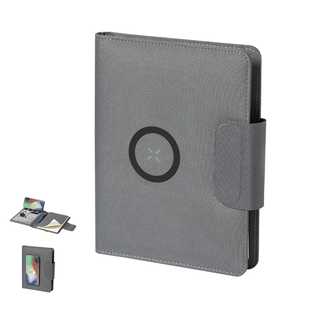Carpeta/bloc multifunción fabricada en poliéster 300D RPET, elaborado a partir de plástico reciclado, para así fomentar la reutilización de residuos plásticos y ayudar a la sostenibilidad del planeta. Con cierre magnético y etiqueta interior con distintivo RPET. Incluye cargador inalámbrico 10W integrado en portada, con fijación magnética para poder usar el dispositivo mientras se produce la carga del mismo e incluyendo anillo adhesivo, válido para todos los dispositivos con tecnología Magsafe y Qi. Batería integrada de 5.000 mAh de capacidad de carga, con puerto Tipo C de entrada/salida y LEDs indicadores de estado de carga, con cable incluido. Interior con soporte para smartphone y multitud de compartimentos para tarjetas, incluidos soporte para bolígrafo y bloc A5 con 65 hojas de disposición a una raya. Presentada en atractiva caja individual de diseño. Las capacidades mostradas en todas nuestras baterías auxiliares externas son reales, incorporando todas ellas baterías de grado A y no recicladas, con una vida útil de al menos 500 ciclos de carga y según normativa CE. Además, están fabricadas conforme a los estándares RoHS y en cumplimiento con los siguientes requisitos de seguridad: Sistema de protección contra sobrecarga del power bank. Sistema de protección contra descarga completa que proporciona una mayor durabilidad del power bank. Sistema de bloqueo para evitar cortocircuitos. Sistema de transferencia de carga constante, acorde con la capacidad del dispositivo de destino.