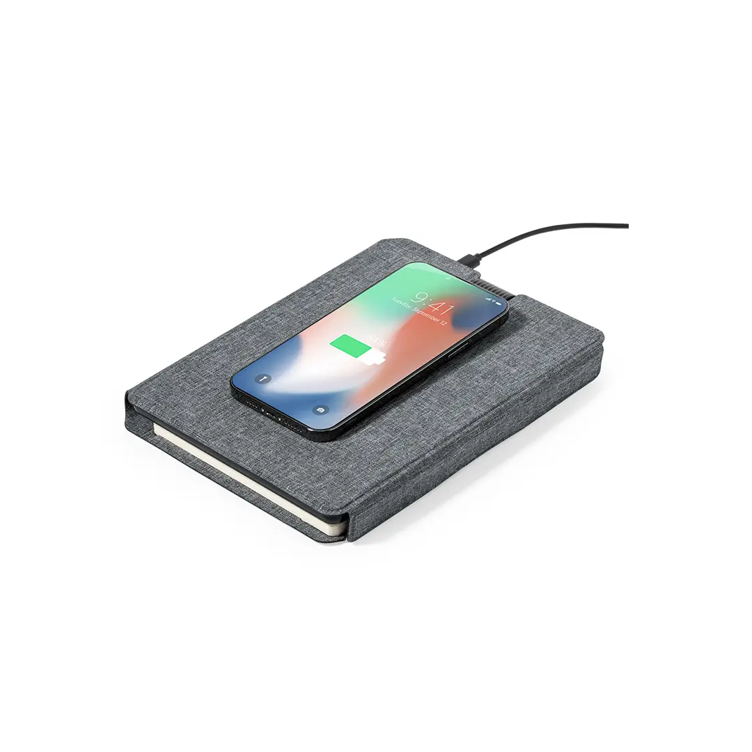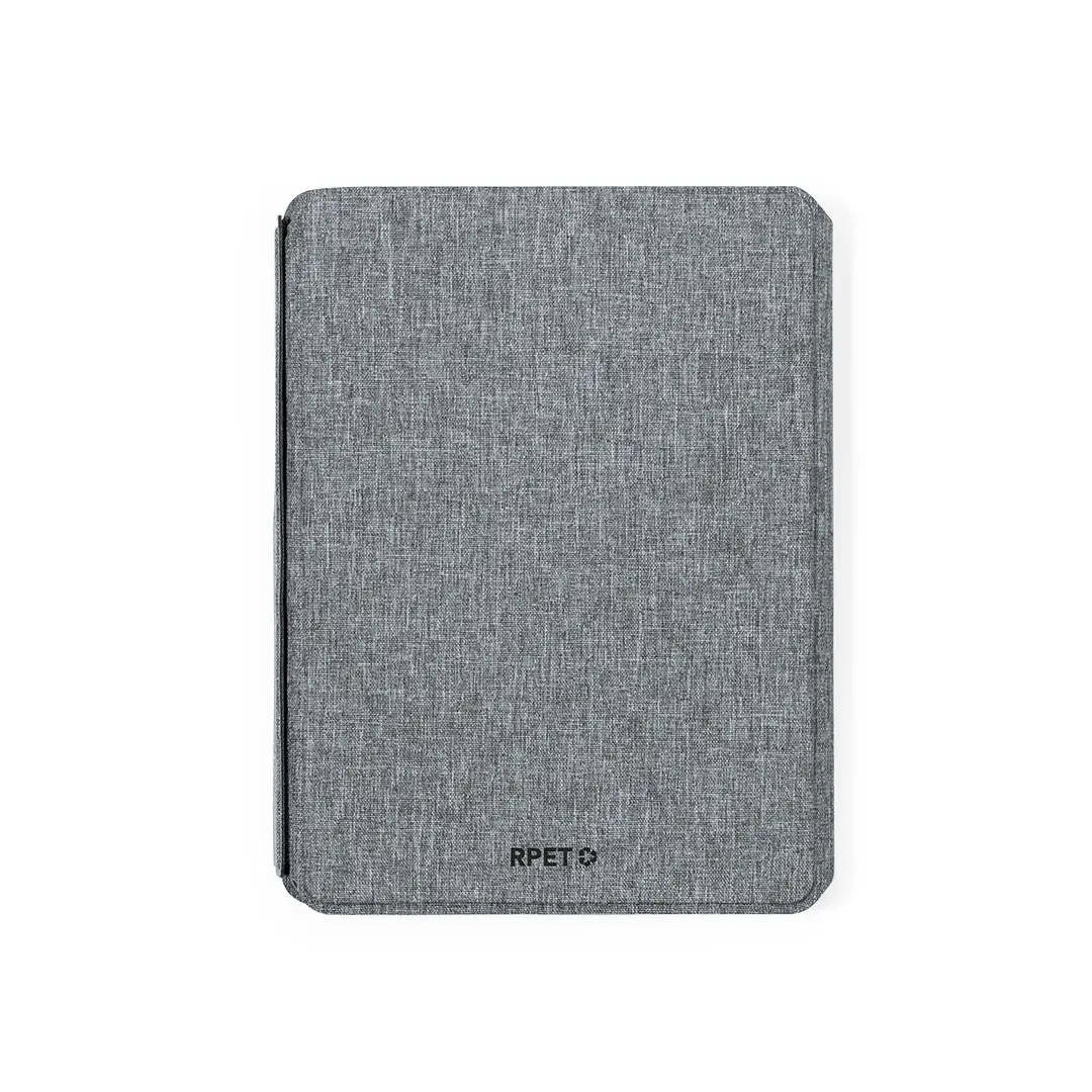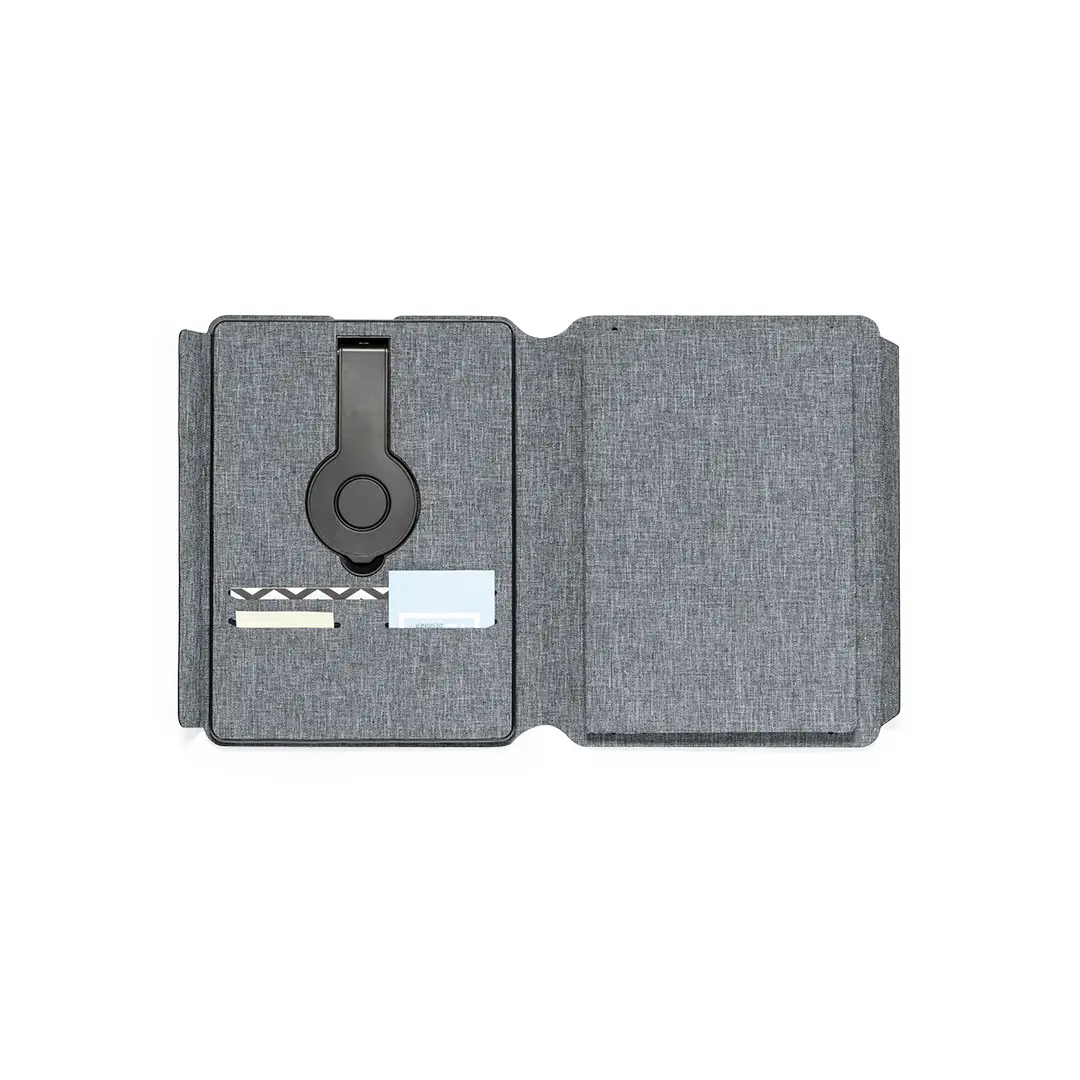 Carpeta/bloc multifunción con cierre magnético fabricada en poliéster 300D RPET, elaborado a partir de plástico reciclado, y etiqueta interior con distintivo RPET.Cargador inalámbrico de 10W, con fijación magnética y multiposición, integrado en portada, que permite usar el dispositivo mientras se está cargando. Accesorio anillo adhesivo incluido, compatible con todos los dispositivos equipados con tecnología Magsafe y Qi. Con cargador inalámbrico para smartwatch en la contraportada interior.Batería integrada de 5.000 mAh de capacidad de carga, con puerto Tipo C de entrada/salida y LEDs indicadores de estado de carga, con cable cargador incluido.Interior con soporte para smartphone y multitud de compartimentos para tarjetas. Soporte para bolígrafo y bloc interior A5 de 64 hojas, con disposición a una raya.Presentada en atractiva caja individual de diseño.Las capacidades mostradas en todas nuestras baterías auxiliares externas son reales, incorporando todas ellas baterías de grado A y no recicladas, con una vida útil de al menos 500 ciclos de carga y según normativa CE. Además, están fabricadas conforme a los estándares RoHS y en cumplimiento con los siguientes requisitos de seguridad:Sistema de protección contra sobrecarga del power bank.Sistema de protección contra descarga completa que proporciona una mayor durabilidad del power bank.Sistema de bloqueo para evitar cortocircuitos.Sistema de transferencia de carga constante, acorde con la capacidad del dispositivo de destino.