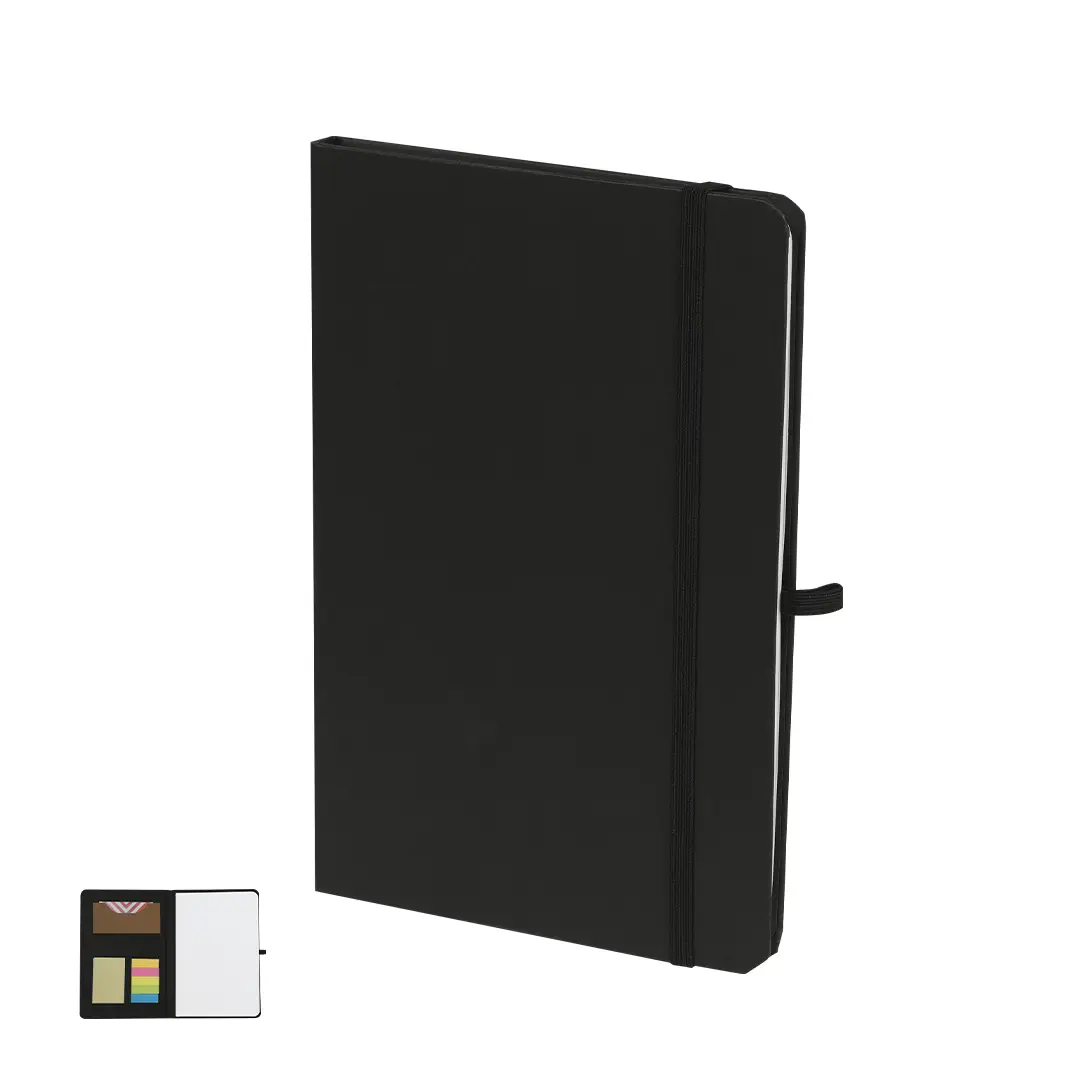 Bloc con notas adhesivas en cartón reciclado. Con tapas rígidas y 80 hojas lisas. En la cubierta interior de la portada incluye: 25 hojas adhesivas amarillas, 125 mini notas adhesivas de variados colores y práctico tarjetero en color kraft. Con soporte para bolígrafos y cinta elástica a juego.El Cartón Reciclado proviene del reaprovechamiento de excedente de fabricaciones y reciclaje de papel en el final de su vida útil, convirtiéndose en un lienzo ecológico y sostenible.