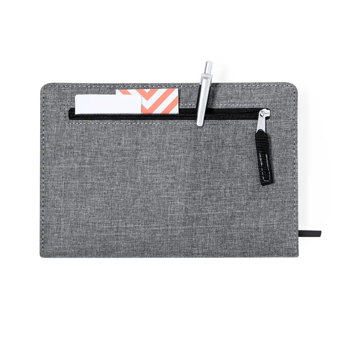 Bloc de notas fabricado en RPET 300D. Con tapas duras y bolsillo en tapa trasera con cierre de cremallera. Incluye 100 hojas a una raya, elástico de cierre y sujeta bolígrafo lateral. En color gris con elegantes detalles en negro. Logotipo RPET en contraportada.El material RPET se elabora a partir de plástico reciclado, para así fomentar la reutilización de residuos plásticos y ayudar a la sostenibilidad del planeta.