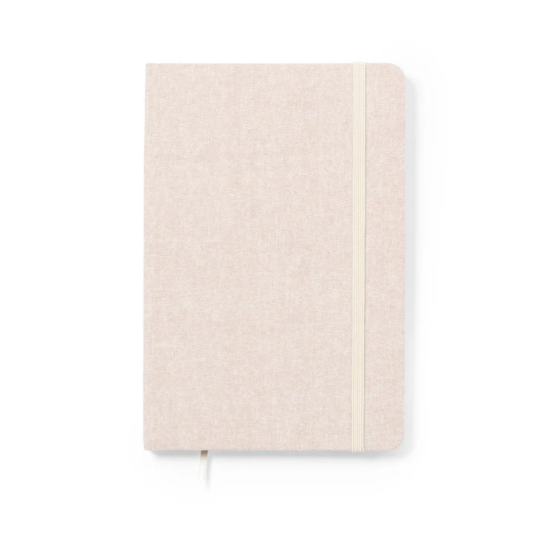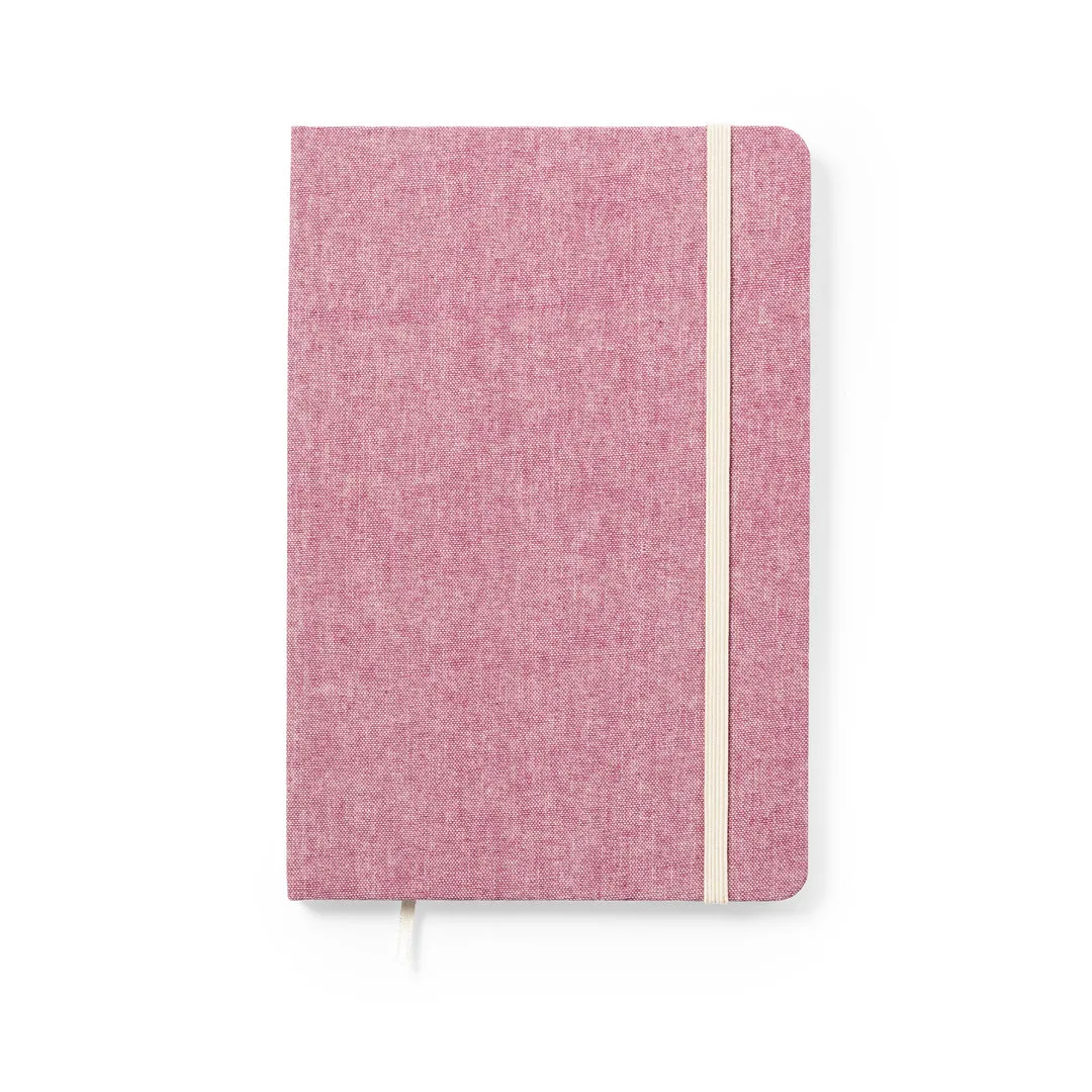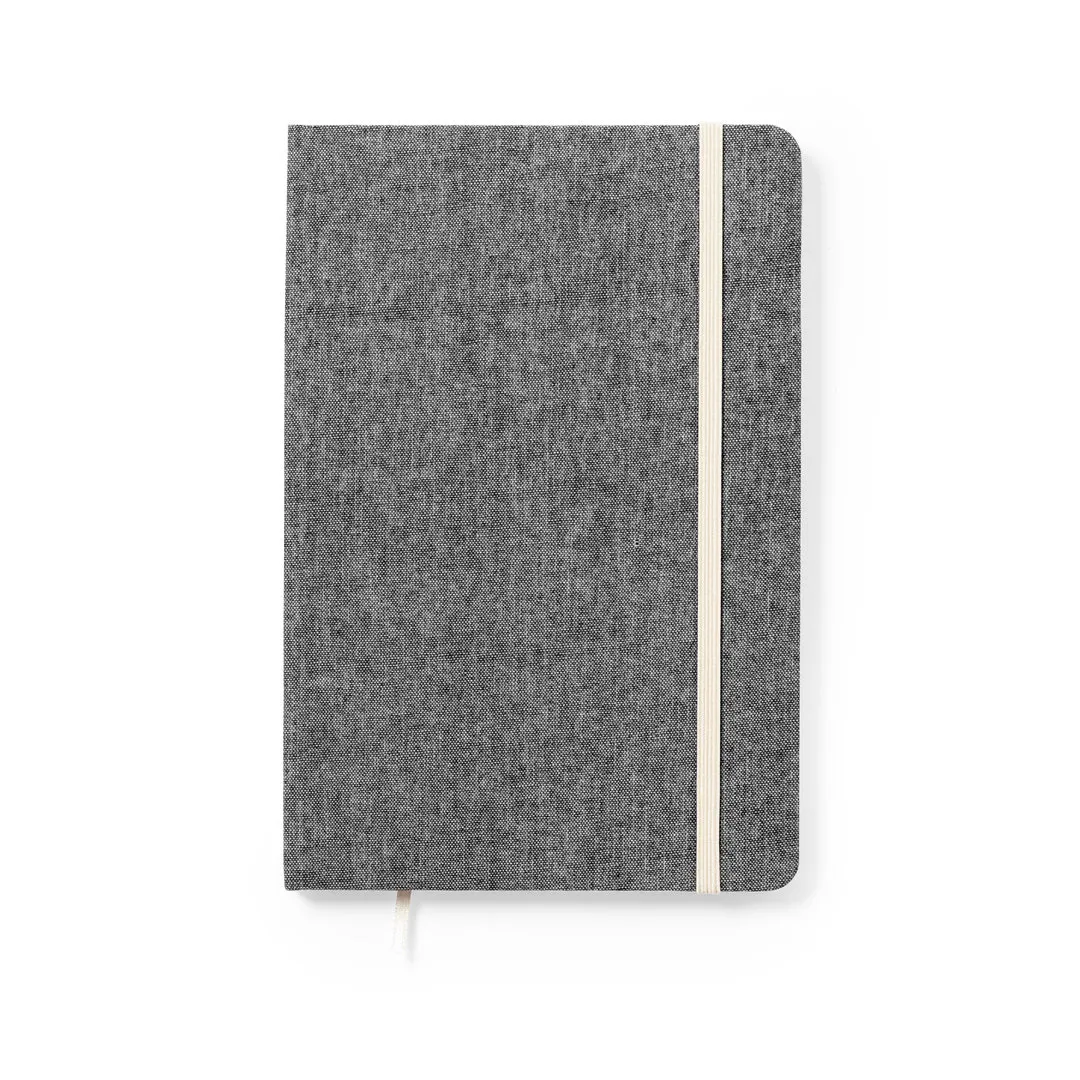 Bloc de notas de línea nature fabricado en 100% algodón reciclado. Con tapas duras y elástico de sujeción en contraste. Interior con 100 hojas lisas y marcapáginas de tela. Disponible en amplia gama de colores, con distintivo algodón reciclado en la contraportada. Certificación GRS (Global Recycled Standard / Estándar de Reciclaje Global), que garantiza el origen reciclado del material usado para fabricar el producto